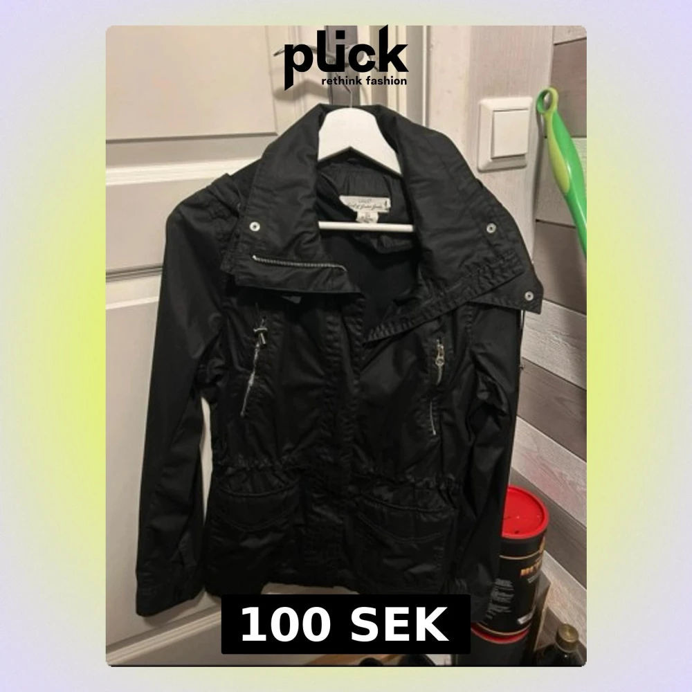 Snygg svart vindjacka från H&M med hög krage och dragkedjor på bröstfickorna. Jackan har justerbar midja och två stora fickor framtill. Perfekt för blåsiga dagar och enkel att matcha med olika outfits.