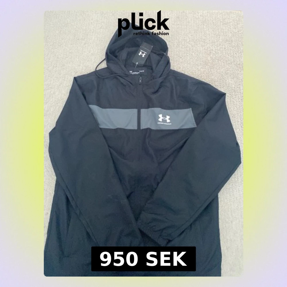 Snygg svart vindjacka från Under Armour med grått band över bröstet och logga. Jackan har huva, dragkedja framtill och meshfoder för extra komfort. Perfekt för blåsiga dagar och sportiga outfits.