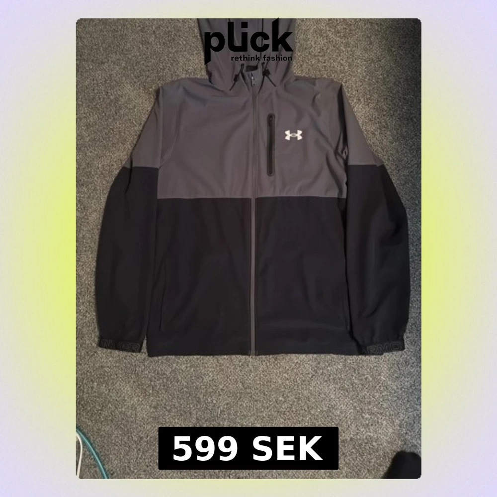 Snygg vindjacka från Under Armour i tvåfärgad design med grå ovandel och svart nedtill. Jackan har huva, hel dragkedja, bröstficka med dragkedja och logga på bröstet. Perfekt för blåsiga dagar och sportiga outfits.