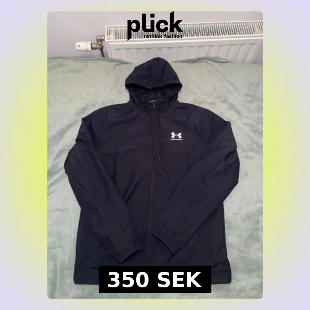 Svart vindjacka från Under Armour med huva och dragkedja framtill. Jackan har vitt logotryck på bröstet och är tillverkad i lätt, vindtätt material med meshfoder. Perfekt för blåsiga dagar och sportiga outfits. Använd någon gång bara den är i stortsätt ny!