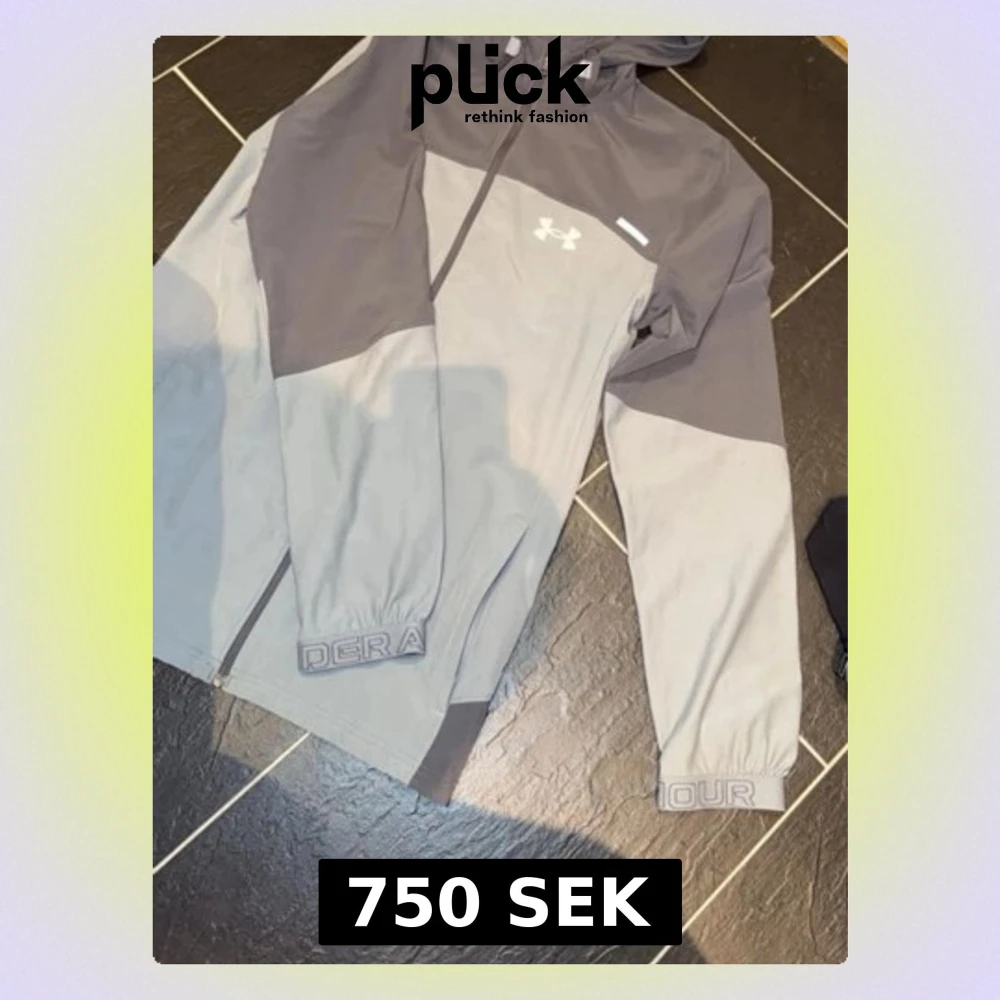 Snygg tvåfärgad vindjacka från Under Armour i ljusgrått och mörkgrått. Jackan har huva, dragkedja framtill och elastiska muddar med logga på ärmarna. Stor logotyp på bröstet och längs ryggen. Perfekt för blåsiga dagar och sportiga outfits.
