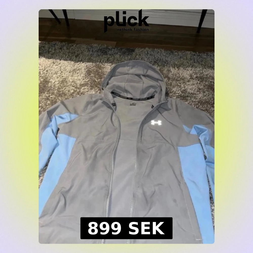 Snygg grå vindjacka från Under Armour med ljusblå detaljer på ärmarna. Jackan har huva, hel dragkedja och logga på bröstet. Perfekt för blåsiga dagar och sportiga outfits. Helt ny