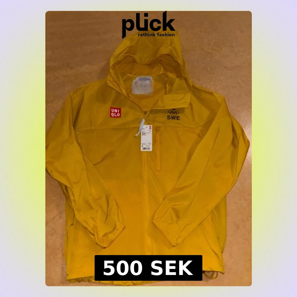 Gul vindjacka från Uniqlo med huva och dragkedja. Jackan har SWE och OS-logga på bröstet samt Uniqlo-logga. Lätt material i polyester, perfekt för blåsiga dagar. Praktisk bröstficka med dragkedja och elastiska muddar vid ärmslut. Vindjackan är från OS i Paris