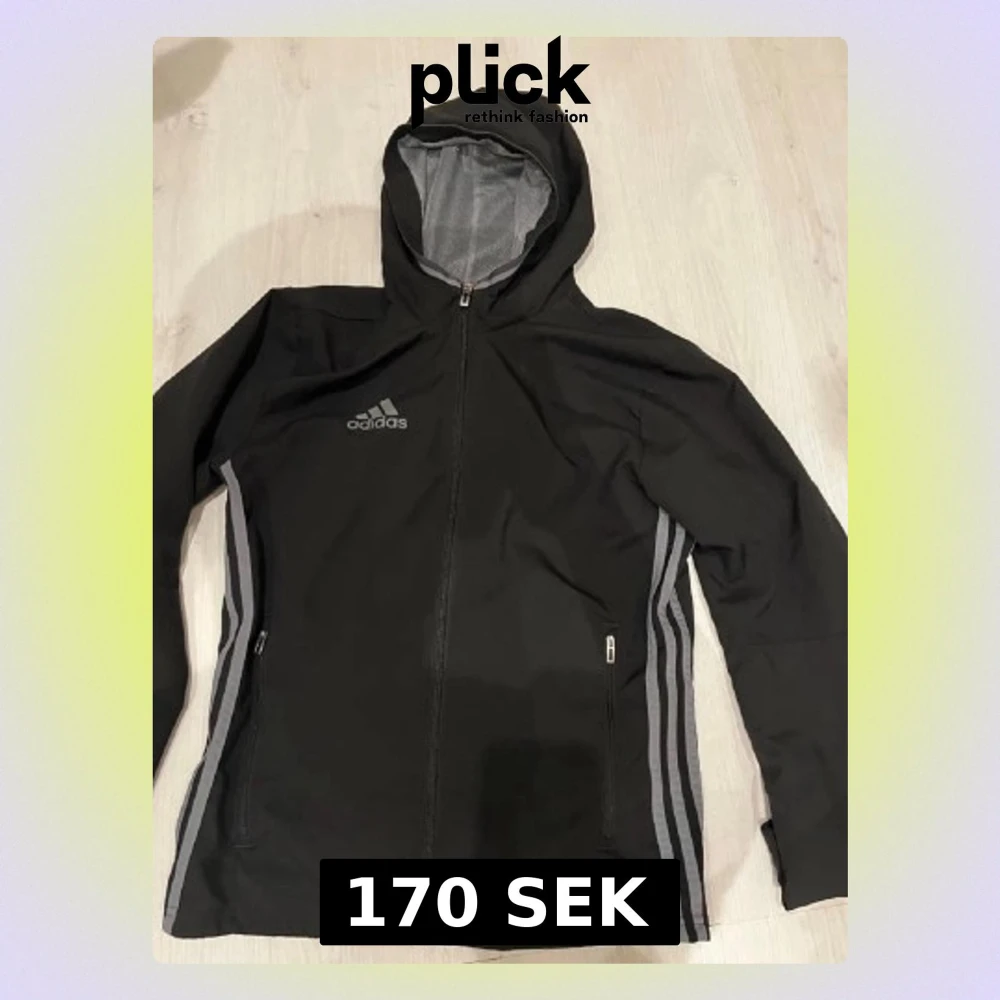 Svarat vindjacka från Adidas i storlek XS med huva och hel dragkedja. Jackan har grå ränder längs sidorna, två fickor med dragkedja och meshfoder. Perfekt för träning och aktiva dagar, med ventilerande detaljer på ryggen och snygg sportig look.
