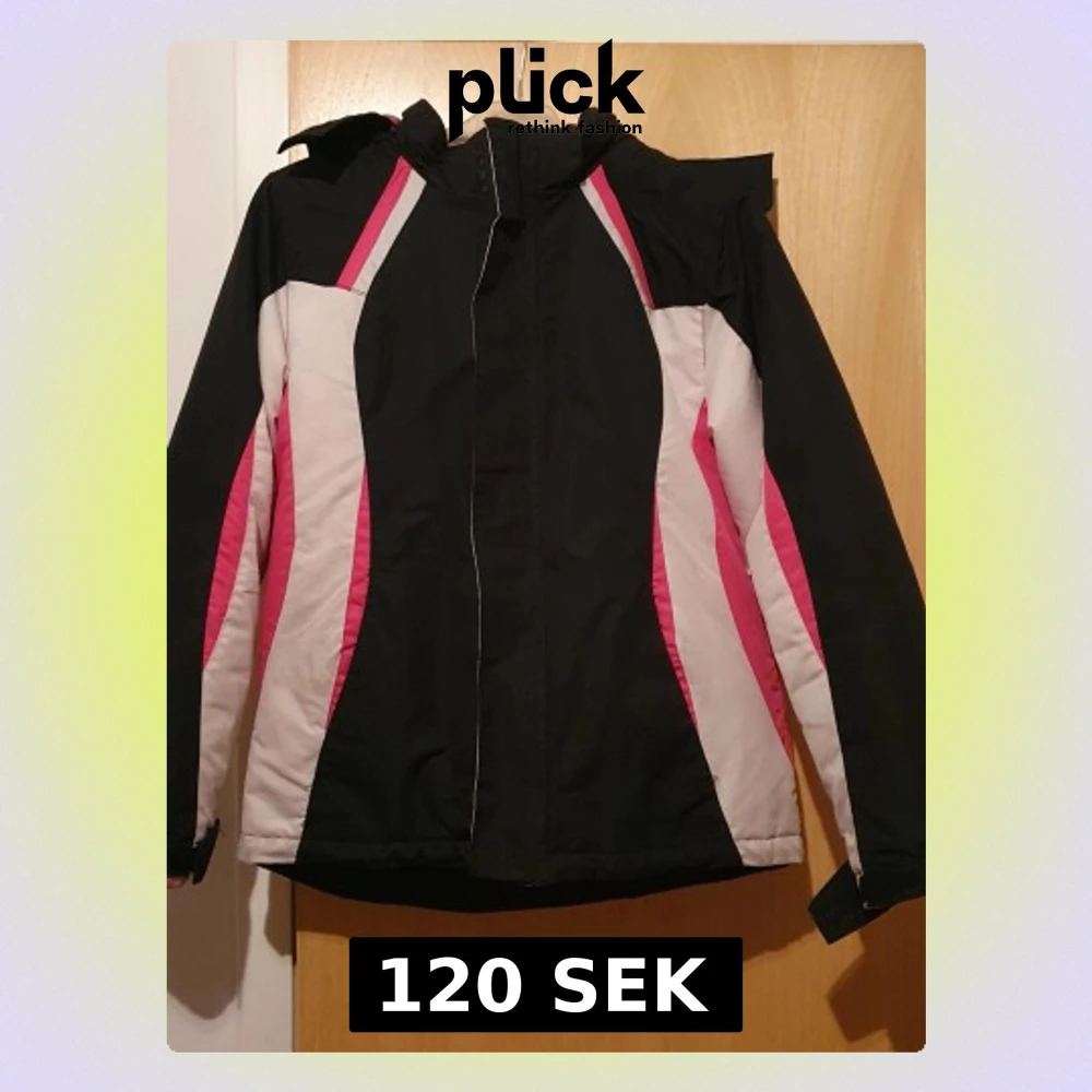 Snygg vinterjacka i svart med rosa och vita detaljer. Jackan har huva, dragkedja framtill och justerbara muddar vid ärmsluten. Fodrad för extra värme och har sportig design med färgblock längs sidorna. Perfekt för kalla dagar och utomhusaktiviteter. Storlek M för flicka. Har fläckar.