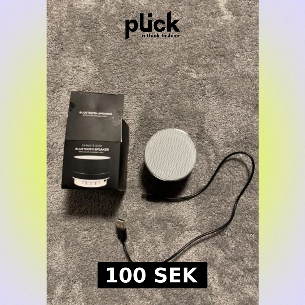 Snygg och kompakt trådlös Bluetooth-högtalare från United i svart och vitt. Rund design med metallgaller på ovansidan och plastdetaljer undertill. Medföljer laddkabel och originalkartong. Perfekt för att streama musik trådlöst från mobilen.
