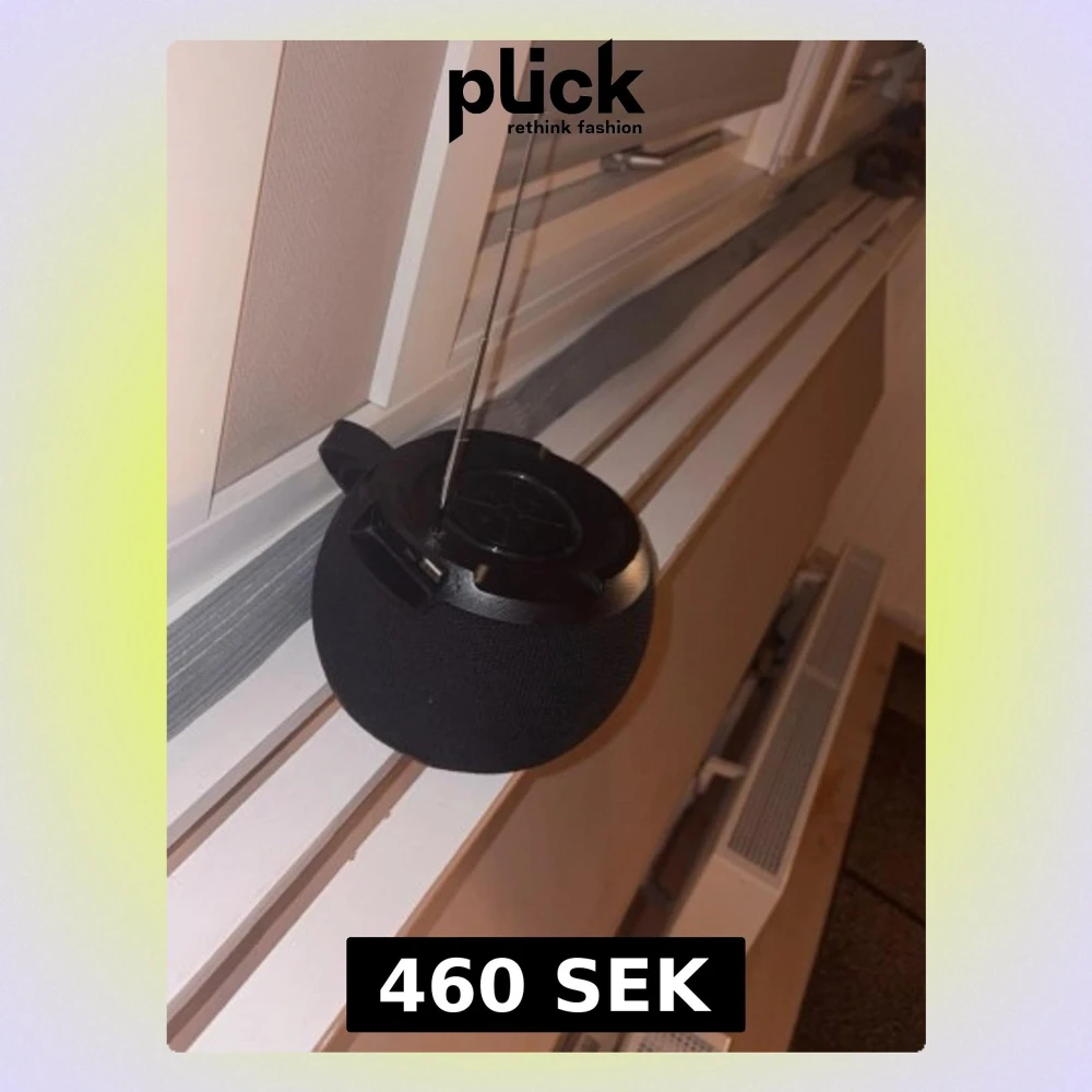 Snygg svart trådlös högtalare med rund form och tygklädd yta. För aktivera radio trycker du M för av aktivera det trycker du igen knappen den är väldig hög Inga fel med den inga problem hög ljud med Samsung laddare.