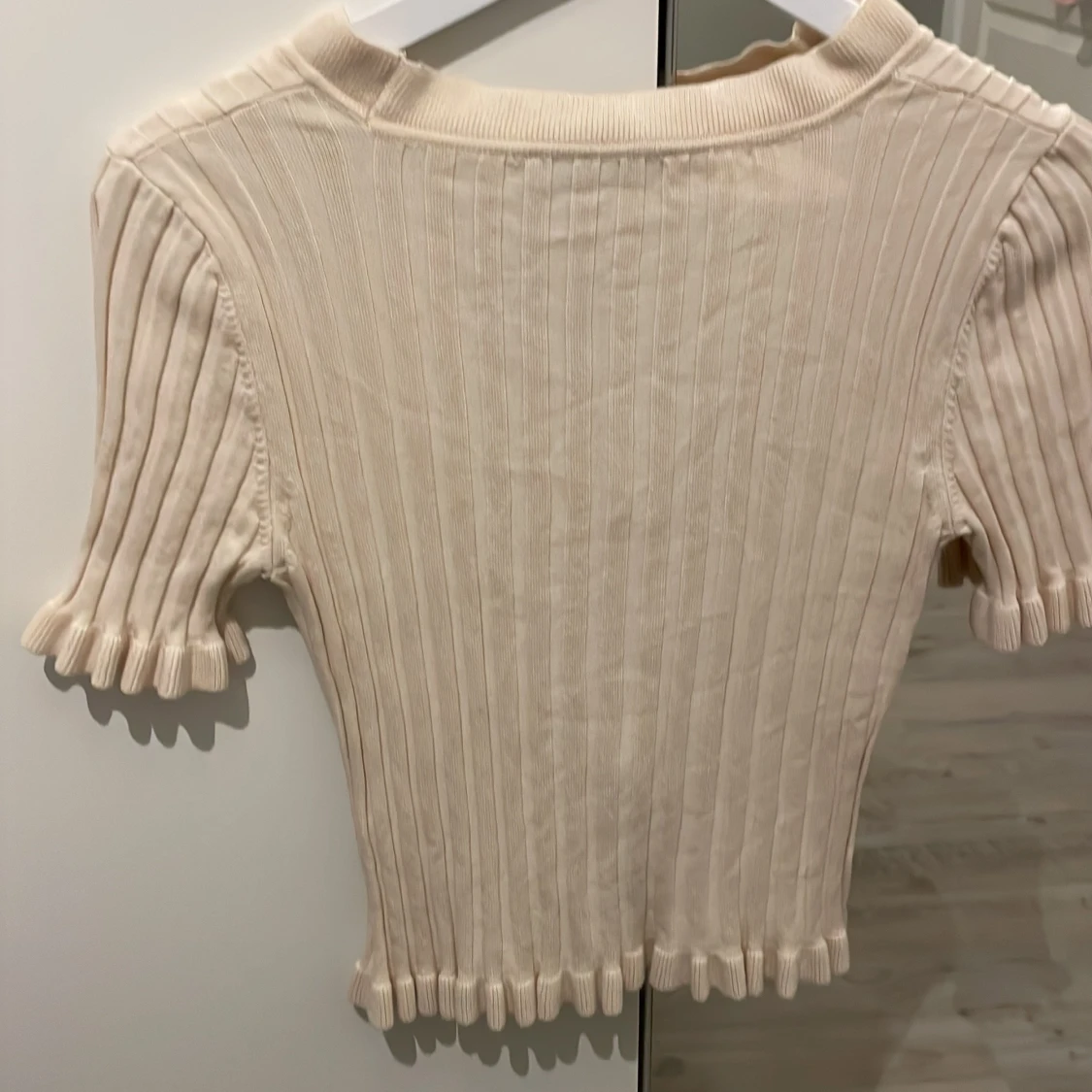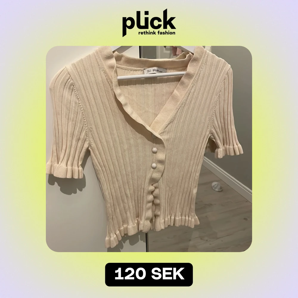 Säljer en superfin beige ribbad kofta från Dilvin. Den har korta ärmar och knappar framtill. Perfekt för både vår och sommar! Koftan är i ett mjukt och bekvämt material, perfekt att ha över en topp eller klänning.