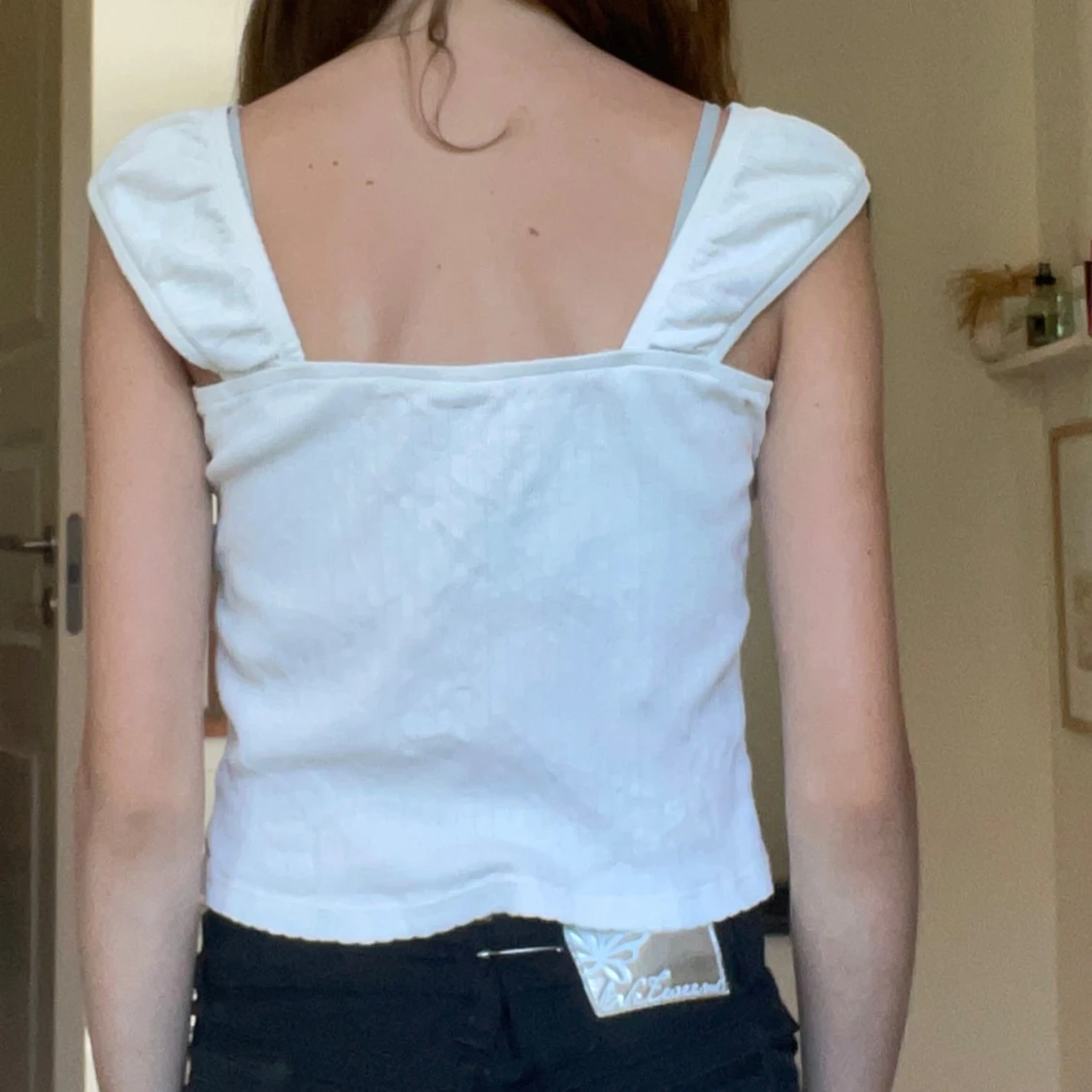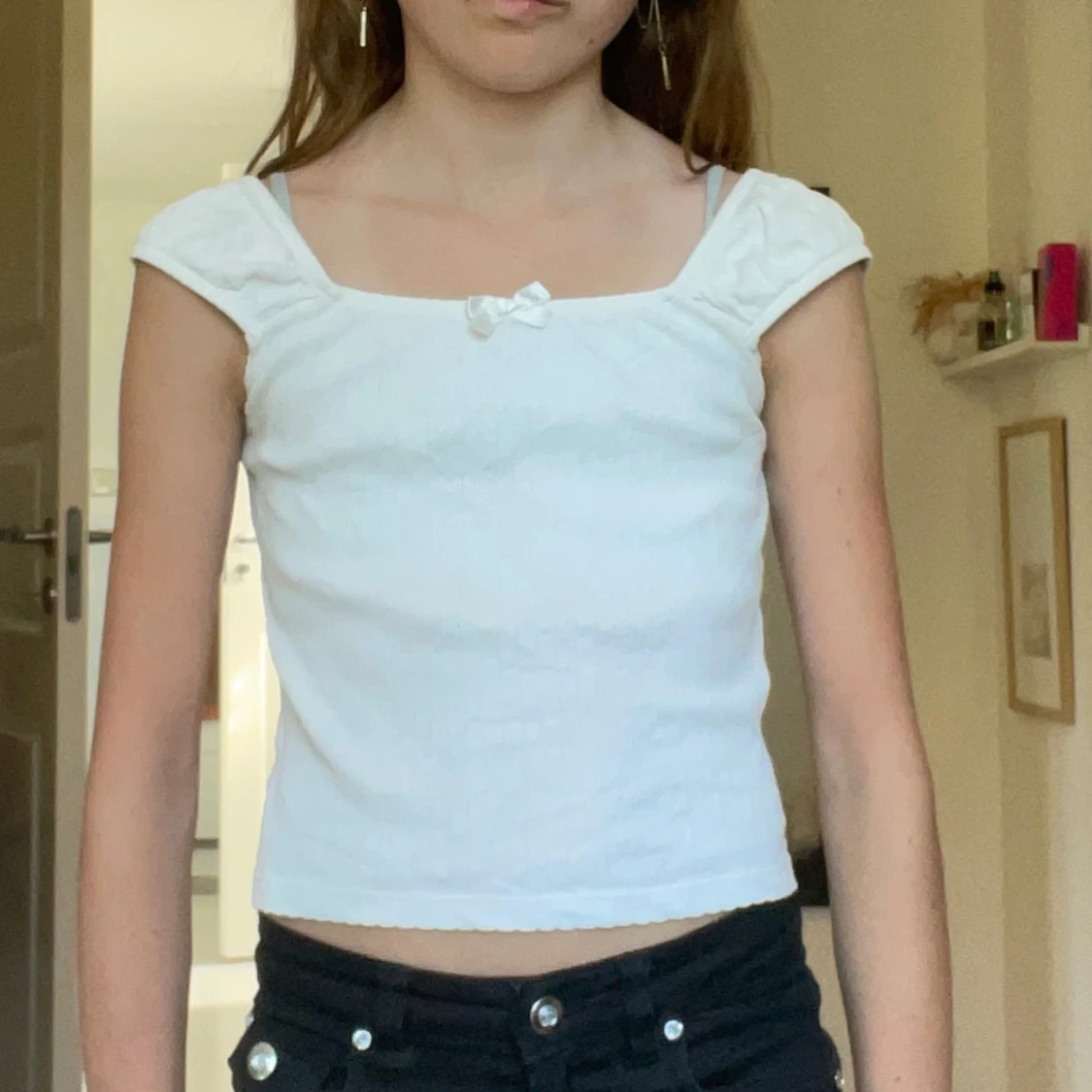 Supersöt vit ribbad linnetopp med breda axelband och liten rosett framtill. Toppen har fyrkantig urringning och croppad passform, perfekt till jeans eller kjol. Materialet är mjukt och stretchigt, vilket gör den riktigt bekväm att bära. Pris går att diskuteras