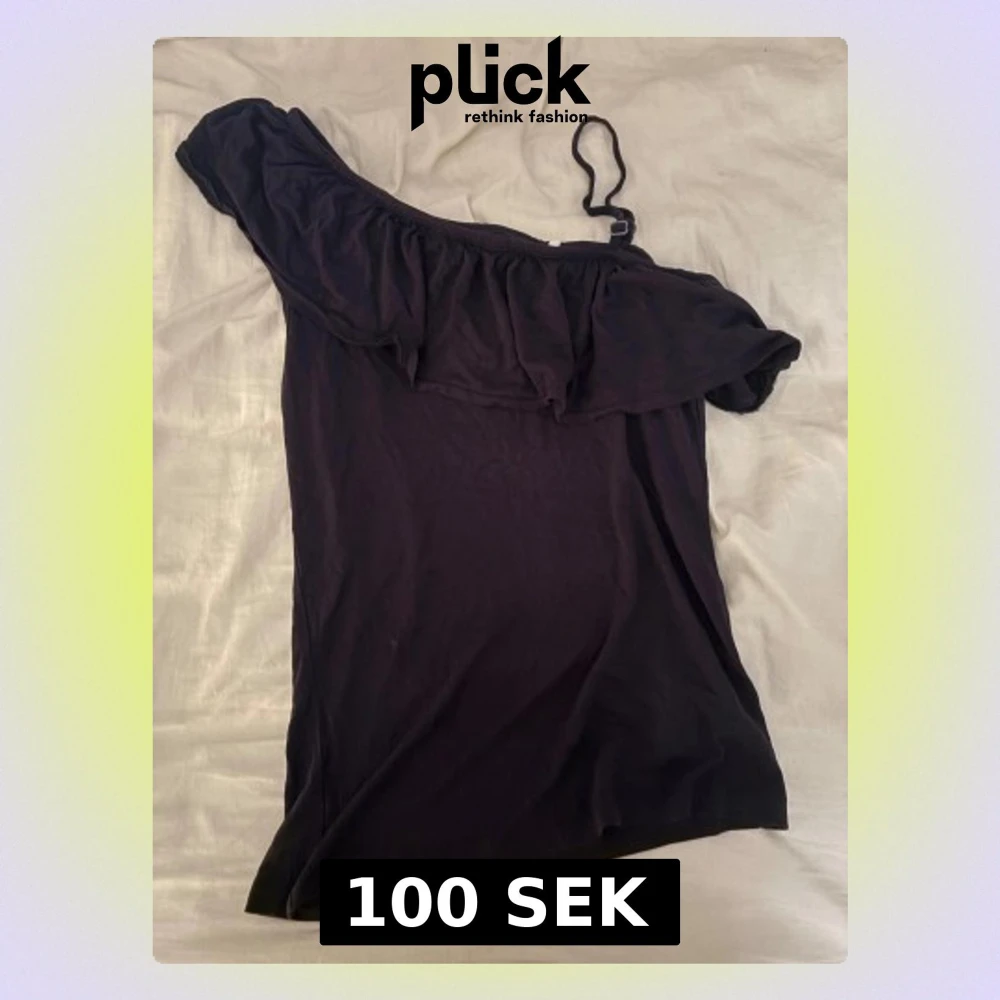 Säljer en svart offshoulder topp från Name It med volang längs halsringningen och ett justerbart axelband på ena sidan. Toppens stil är riktigt snygg och passar perfekt till dig som gillar trendiga detaljer. Materialet är mjukt och skönt, troligen bomull.
