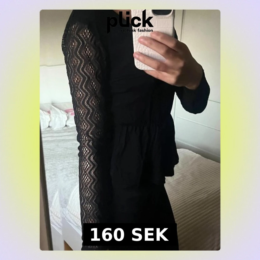 Säljer en svart blus från About You med v-ringning och långa spetsärmar i zigzag-mönster. Blusen har en knytning i nacken och ett lätt rynkat parti vid midjan som ger en hour-glass form. Passa på!💗