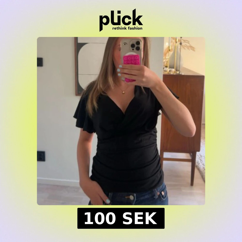 Snygg svart omlottopp med v-ringning och korta, lite fladdriga ärmar. Den är i strl S och är i fint skick!