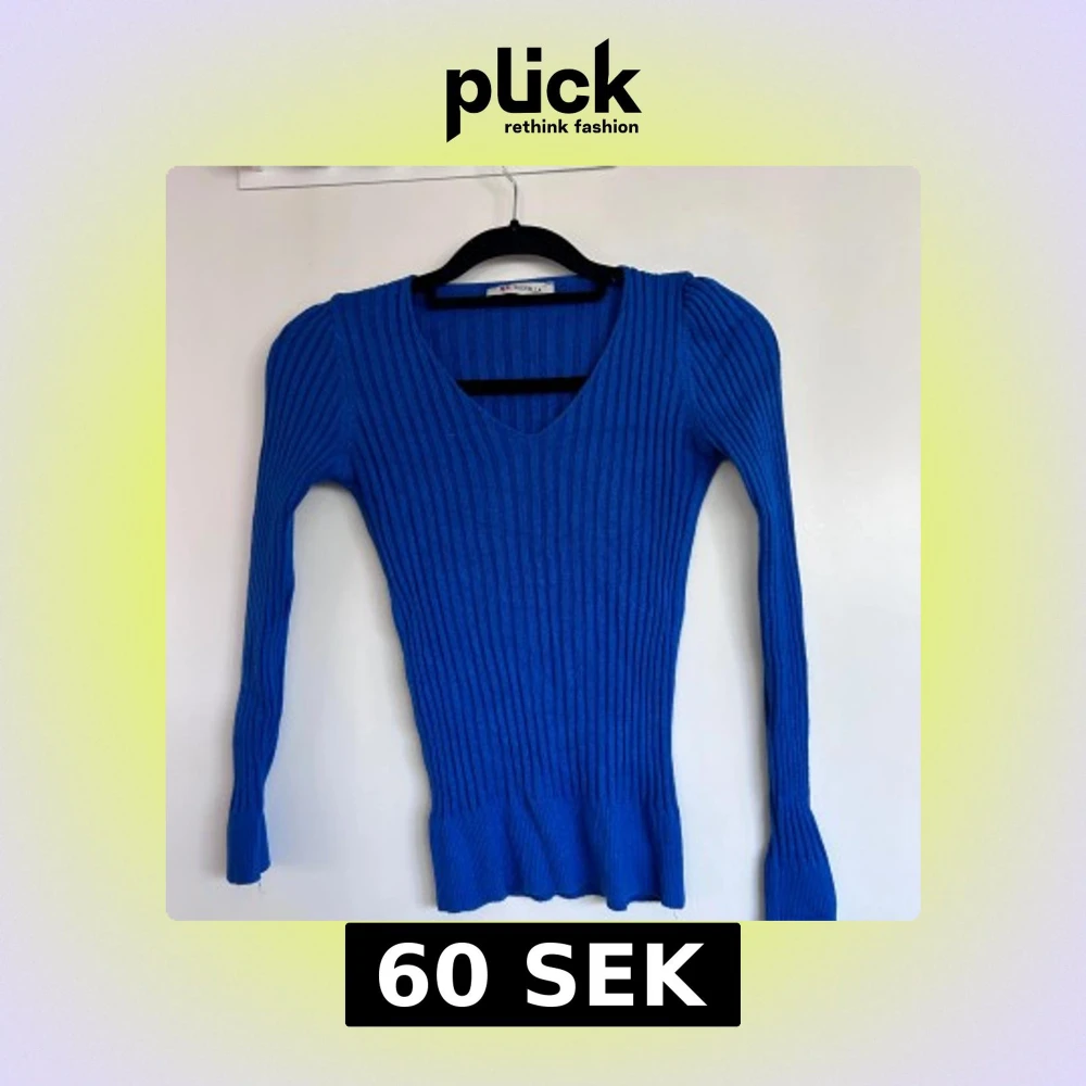 Säljer en blå ribbad tröja från Wienella med v-ringning och långa ärmar. Tröjan har en tight passform och är tillverkad i ett stretchigt material som sitter snyggt på kroppen. Perfekt att styla till jeans eller kjol.