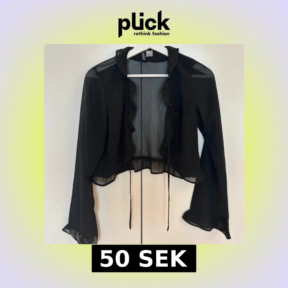 Säljer en svart transparent topp, storlek 36. Toppen har långa ärmar, volangkant längs öppningen och knytband framtill.