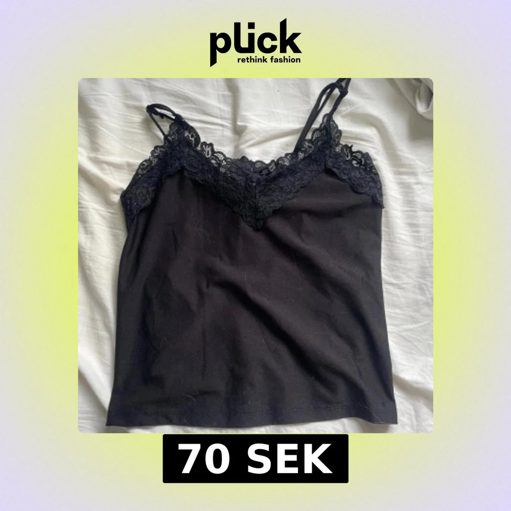 Säljer ett svart linne med smala axelband och vacker spetsdetalj längs urringningen. Toppen har en v-ringad form och är tillverkad i mjukt material, perfekt för lager-på-lager eller som den är. Enkel och stilren design. Ena axelbandet är sönder, kan fixas innan jag postar!