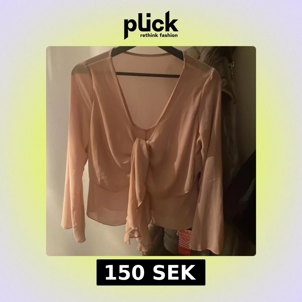Säljer en ljusrosa blus med v-ringning och knyt framtill. Blusen har långa ärmar och är tillverkad i ett tunt, lätt material som ger ett elegant fall.