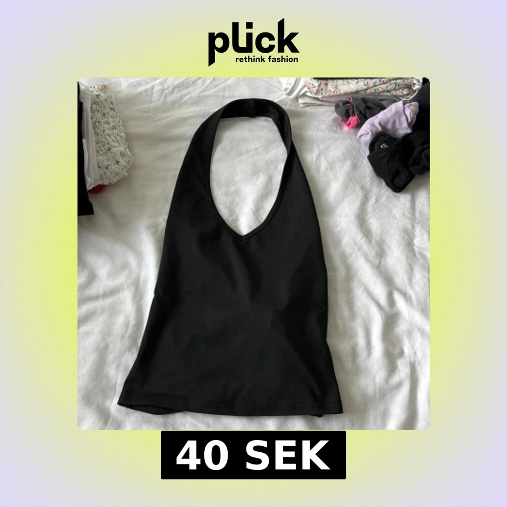 Snygg svart halterneck linne med djup v-ringning och breda axelband som knäpps i nacken. Toppens stilrena design gör den enkel att matcha med olika outfits. Materialet känns mjukt och stretchigt, perfekt för varma dagar.