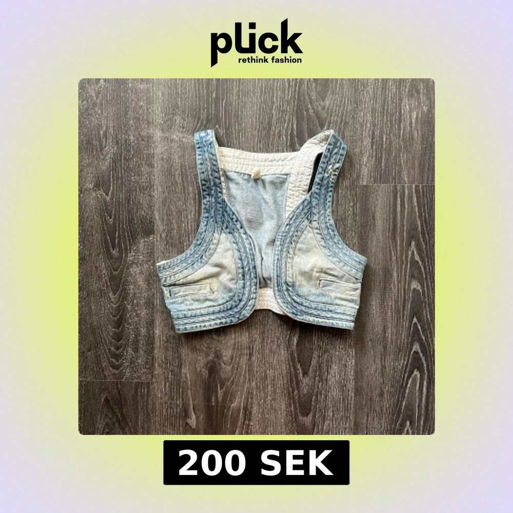 Säljer en croppad ljusblå jeansväst med coola sömdetaljer och justerbart spänne i ryggen. Västen har en sportig form, vita prickiga insidor och fejkfickor framtill. Perfekt att styla över en t-shirt eller klänning för en trendig look. 36/34 ungefär