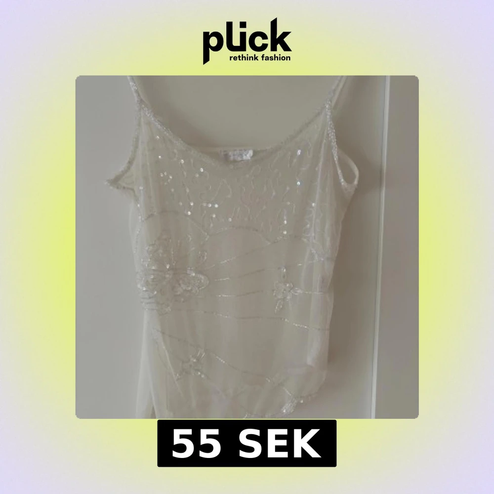 Säljer en vit linnetopp med tunna axelband och transparent mesh. Toppen är dekorerad med paljetter och broderade fjärilar samt blommor, vilket ger en glittrig och romantisk känsla. Perfekt för sommarens alla tillfällen.