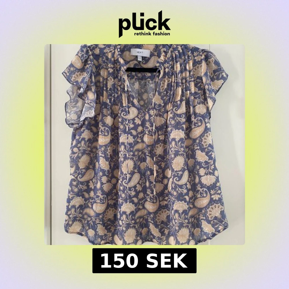 Säljer en luftig blus från Next med blommigt och paisleymönster i beige på blå botten. Blusen har v-ringning, volangiga korta ärmar och är tillverkad i ett tunt, lätt material. Perfekt för dig som gillar boho-vibes och snygga detaljer. Mått Över bröstet: ca 55 cm Längd från axeln och ner: ca 64 100% polyester Kommer från ett djur och rökfritt hem.
