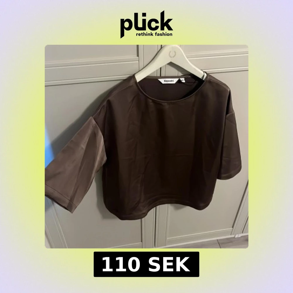 Säljer en brun croppad topp från Kappahl med rund halsringning och trekvartsärmar. Toppen har en slät satinliknande yta och en enkel, stilren design som passar perfekt till många olika outfits.