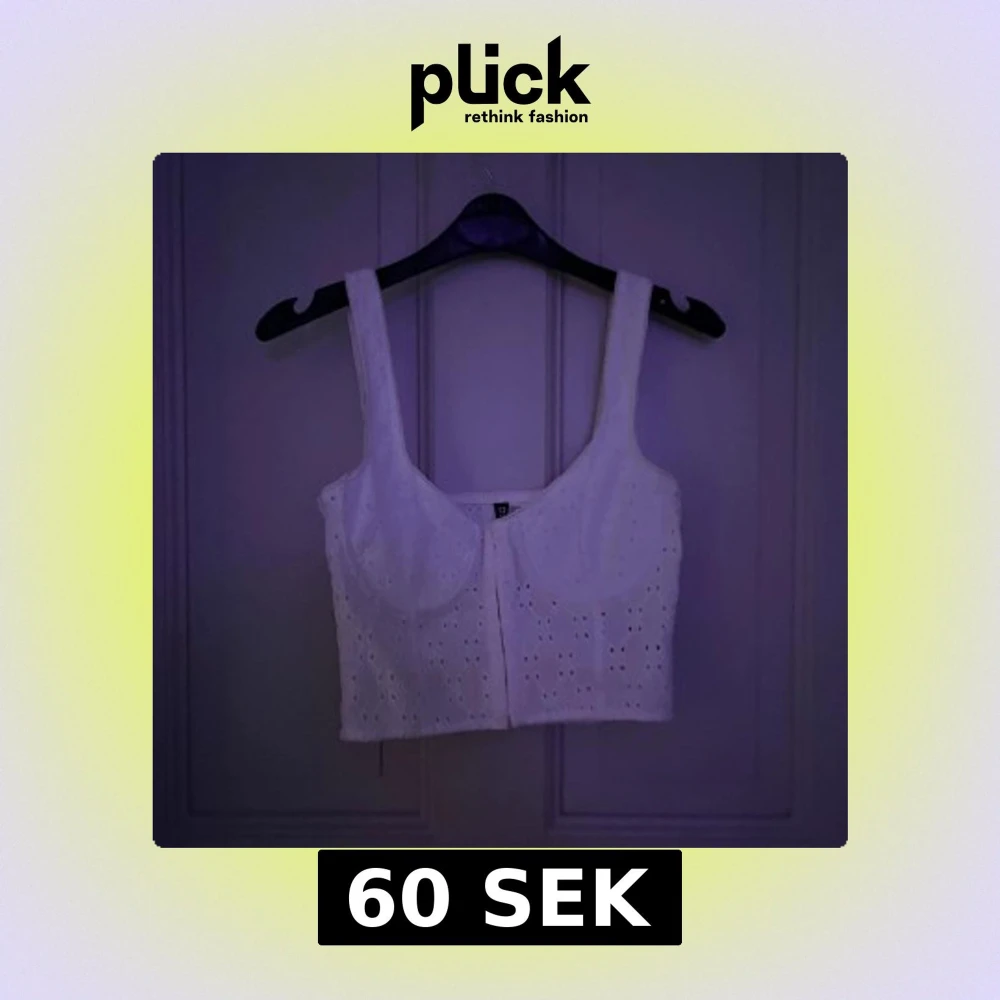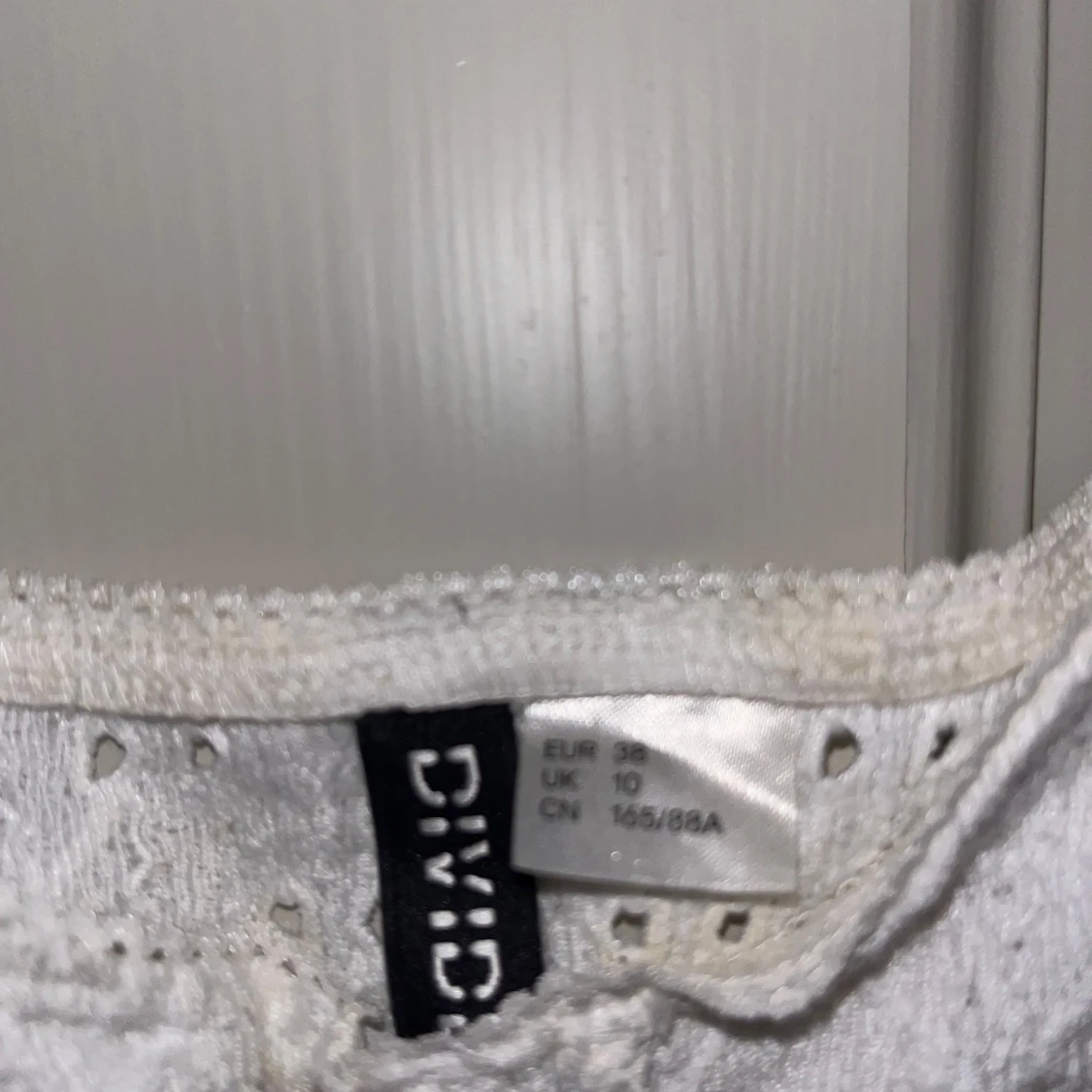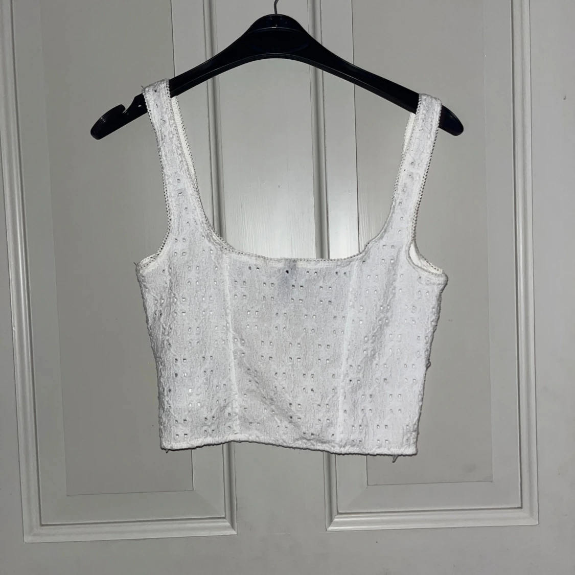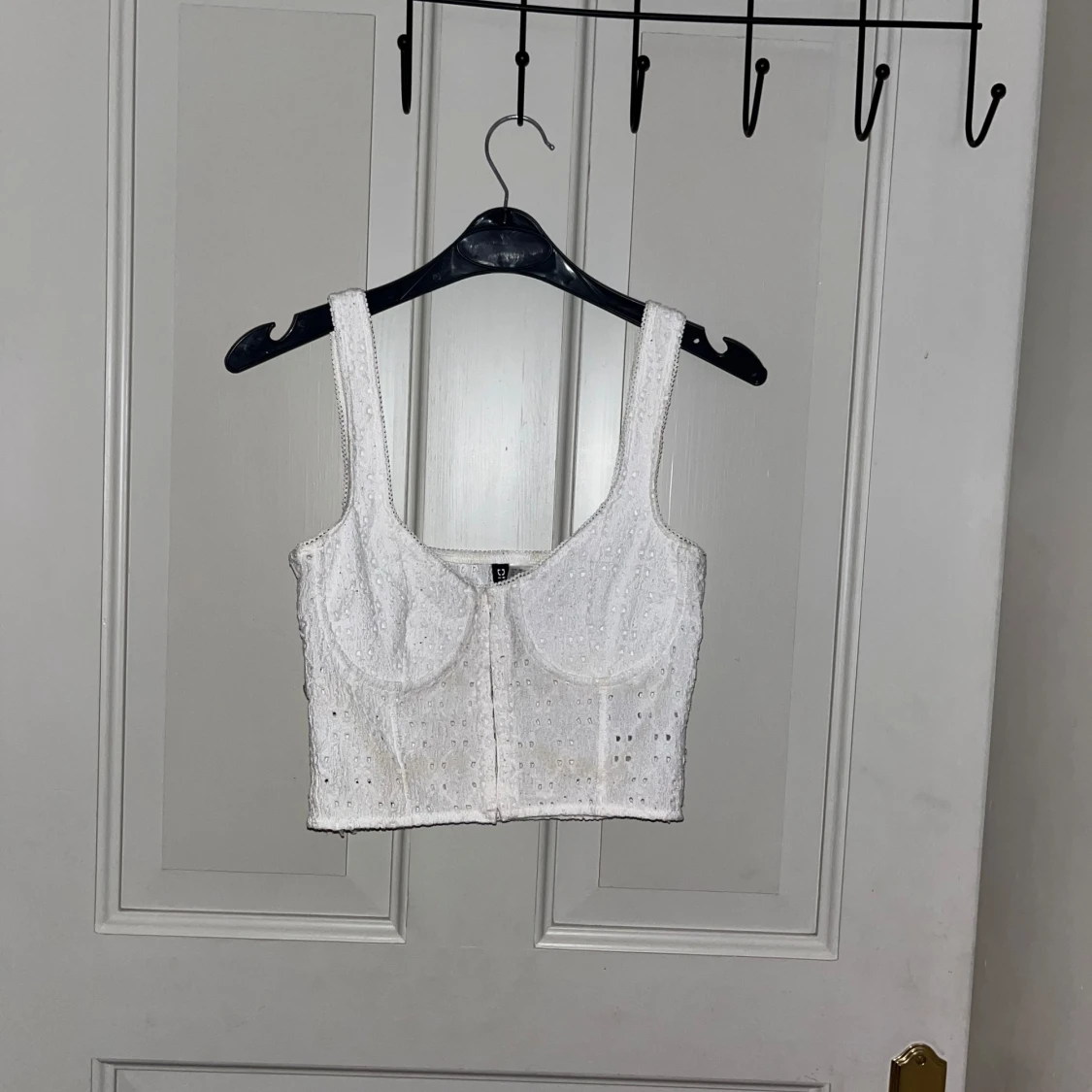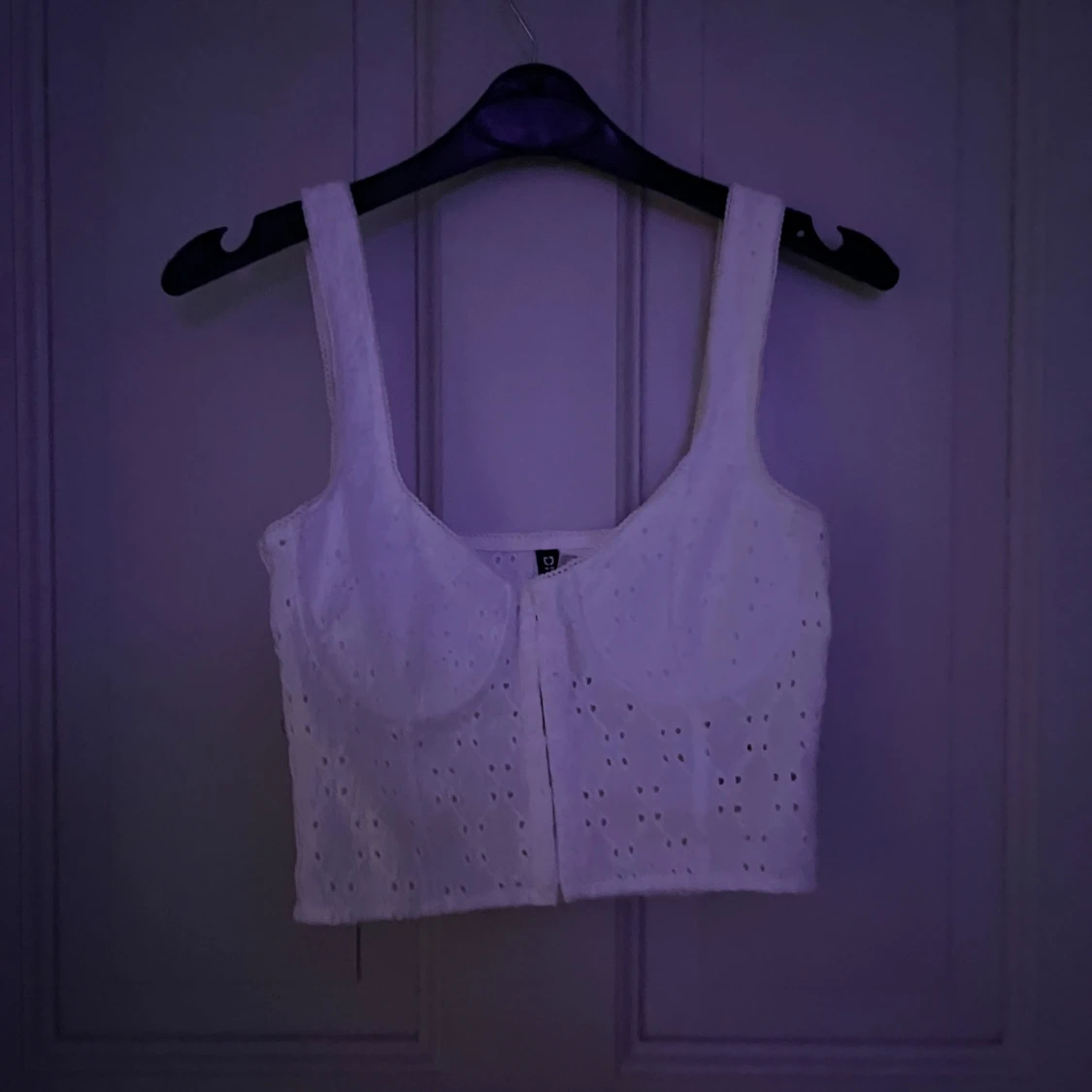 Superfin vit korsett-topp från Divided i storlek 38. Toppen är broderad med små hålmönster och har breda axelband samt markerade kupor. Perfekt till sommaren och ger en fräsch och trendig look med sin croppade passform.
