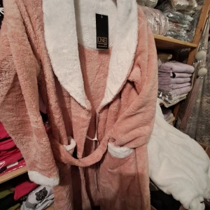 Mysig rosa morgonrock från Line med vit krage och muddar. Den har ett knytband i midjan och är perfekt för att hålla sig varm och bekväm hemma. Materialet är mjukt och fluffigt, vilket gör den extra skön att bära.