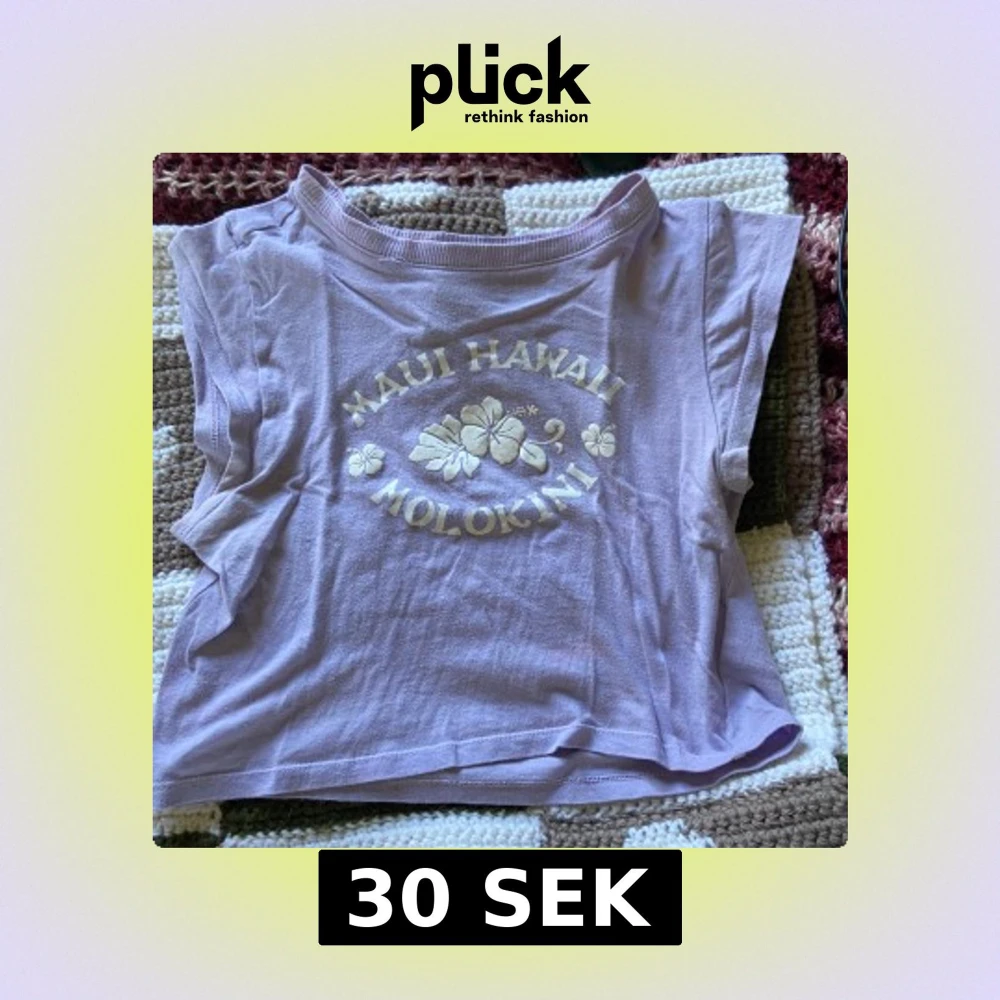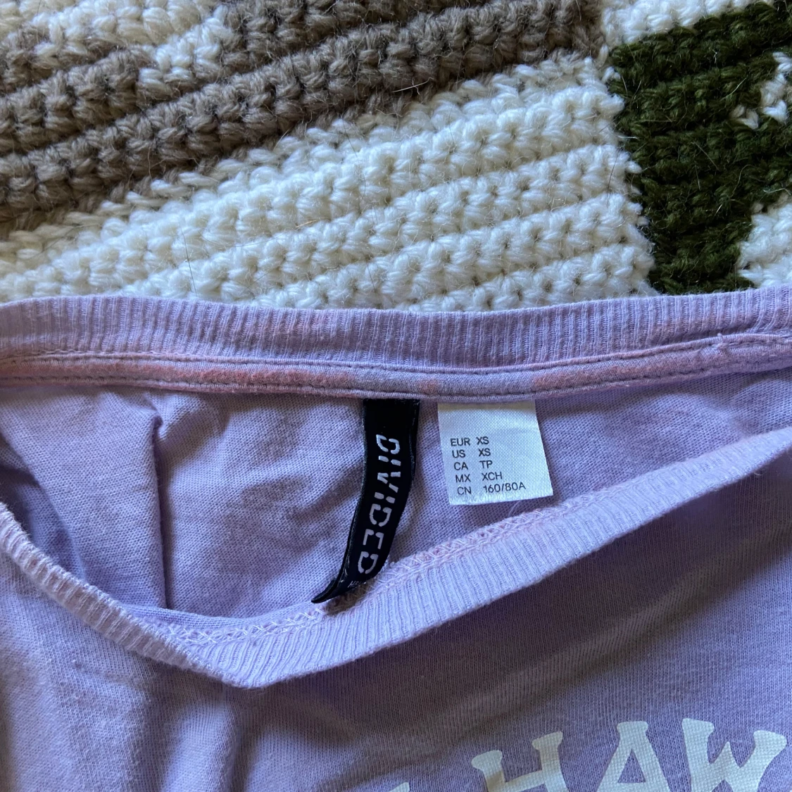 Ljuslila croppad tshirt, vitt tryck på framsidan, storlek XS, från H&M divided. Okej skick, har blivit lite rosafärgad på insidan av hals remmen.