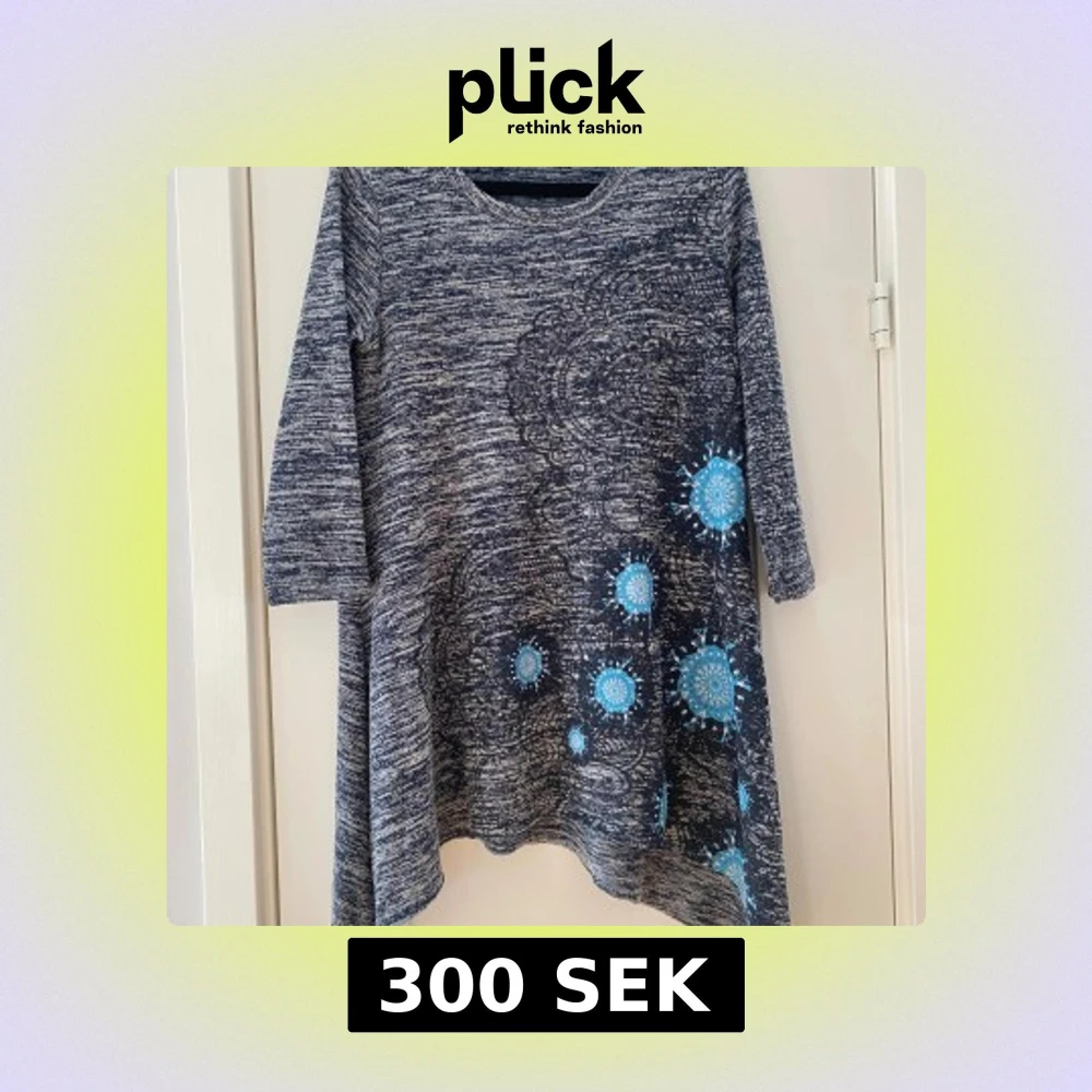 Unik blåmelerad tunika från Desigual i storlek S med coola blå mandala-liknande mönster framtill och baktill. Tunikan har trekvartsärm och är i mjukt stickat material. Passformen är loose. Mått Över bröstet: ca 50 cm Längd från axeln och ner: ca 76 cm Kommer från ett djur och rökfritt hem.