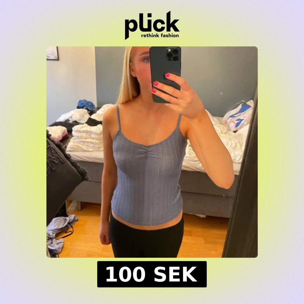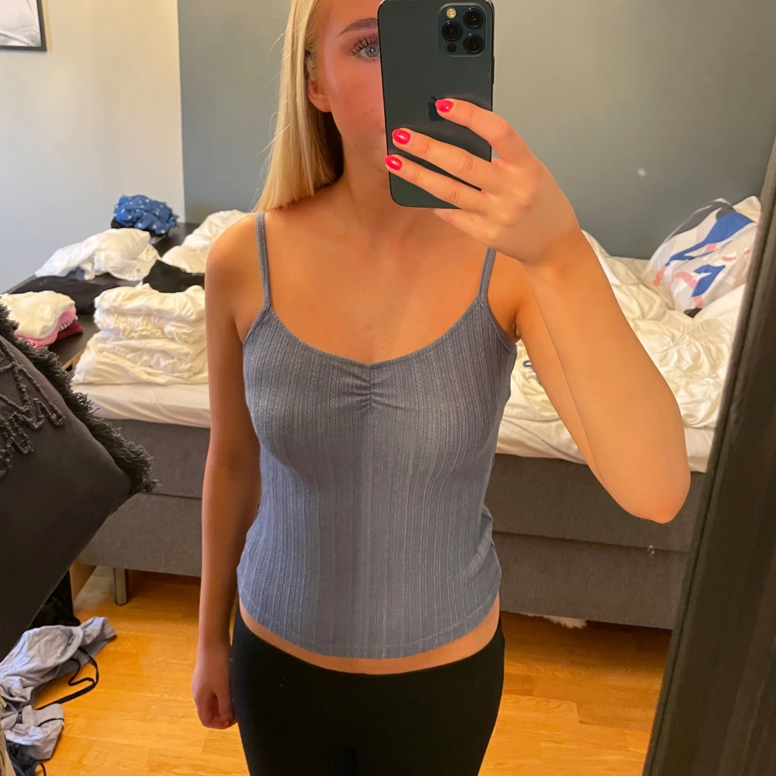 Säljer en blå ribbad linnetopp med smala axelband och lätt rynkning vid bysten. Toppen är croppad och har en slim passform som sitter snyggt mot kroppen. Perfekt för dig som gillar enkel och stilren design med lite edge.