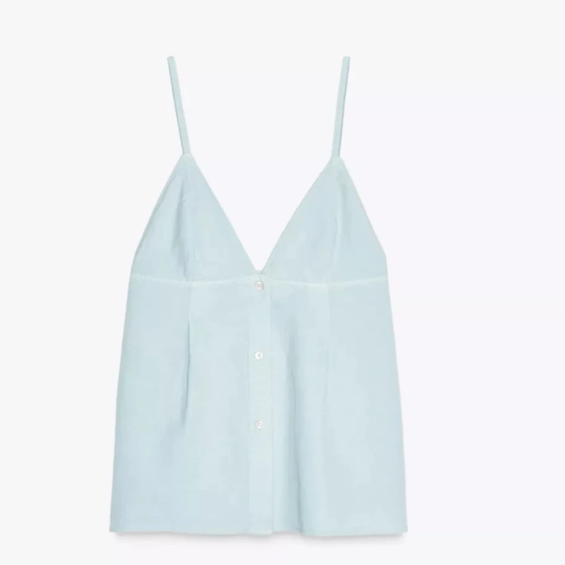 Säljer denna söta topp från Zara. Köpt i storlek L men skulle säga att den även passar M. Säljer pågrund av att den va för stor för mig och därför även har prislappen kvar. Skriv för fler bilder osv🩵🩵 ( banden går att justera)