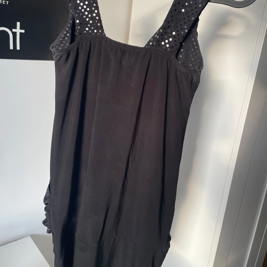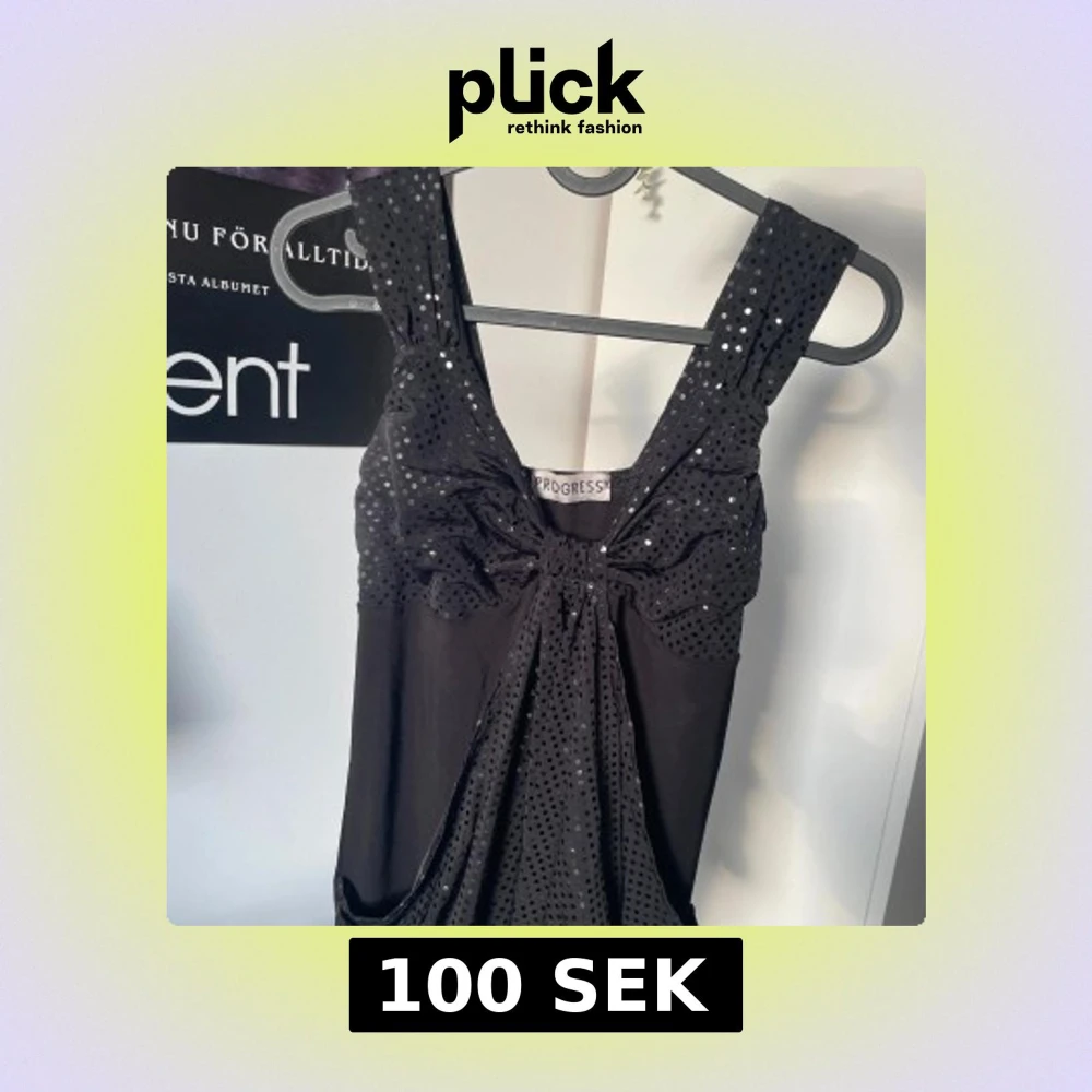 Snygg svart topp från Progress med glittriga detaljer. toppen har breda axelband och en draperad design framtill. Perfekt för en kväll ute eller en speciell tillställning. Tillverkad i polyester och elastan för en bekväm passform. inte mycket utrymme för stora bröst dock tyvärr :(💘