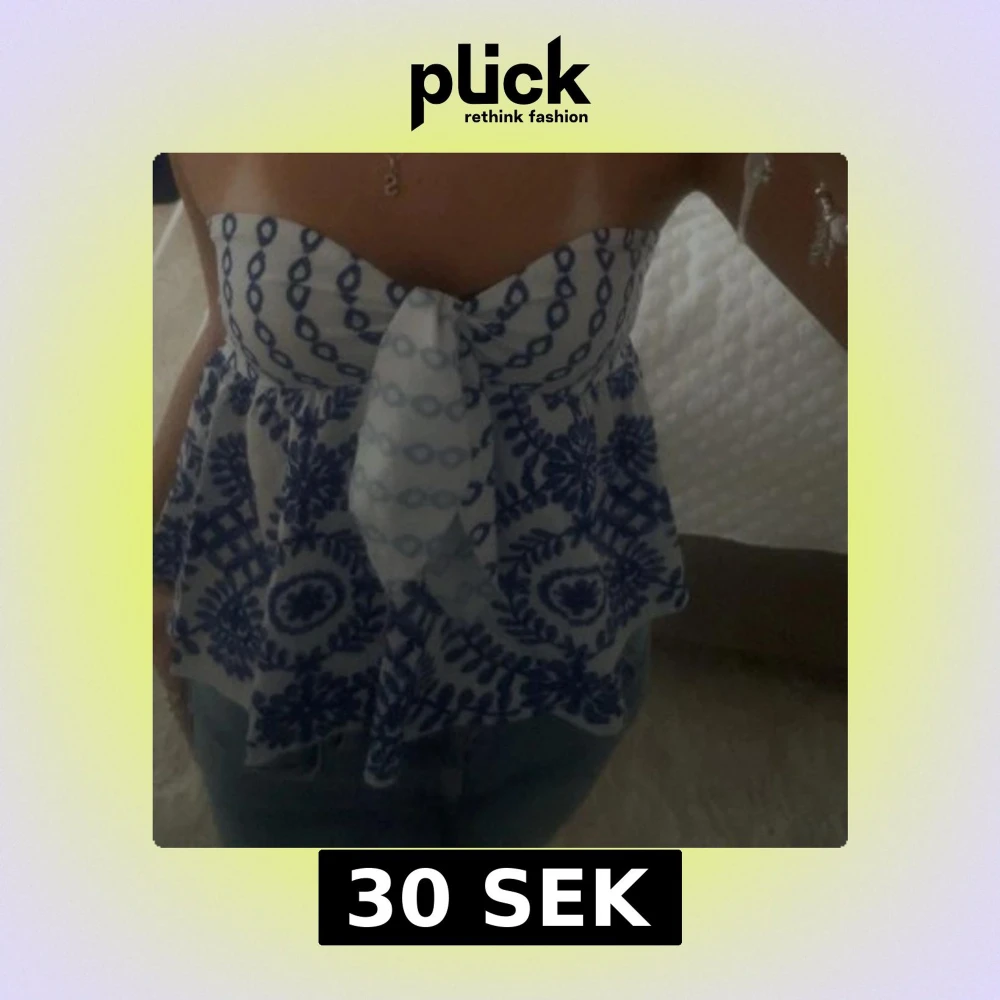 Snygg axelbandslös topp i blått och vitt med ett vackert mönster. Toppen har en knytning framtill och är perfekt för varma sommardagar. Den är luftig och bekväm att bära. Skriv för mer bilder💕Tar gärna emot prisförslag