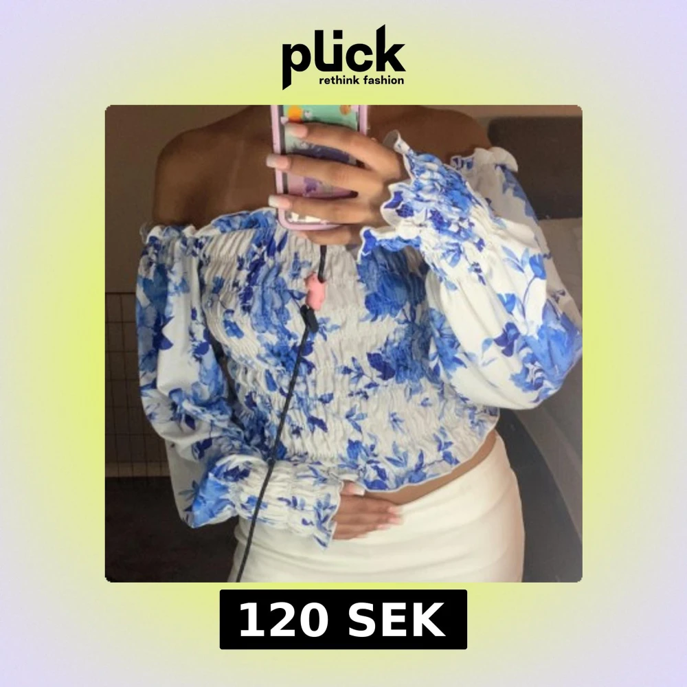 Supersöt blommig blus från Gina Tricot i vitt och blått. Toppen har smockad kropp, långa puffiga ärmar med resår och offshoulder-modell. Perfekt för dig som gillar romantiska vibes och vill sticka ut med ett fräscht mönster.