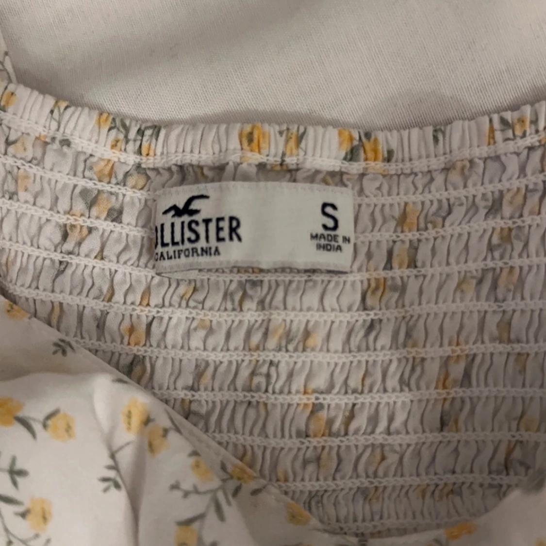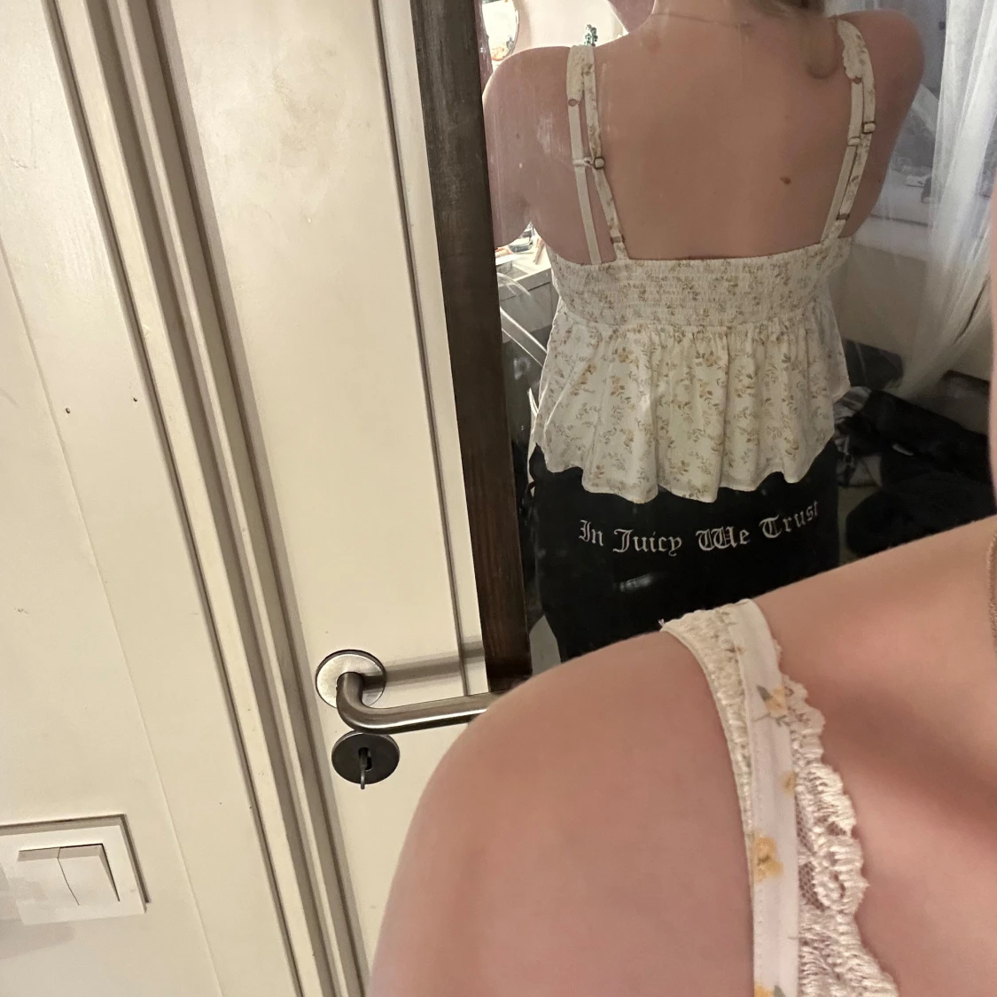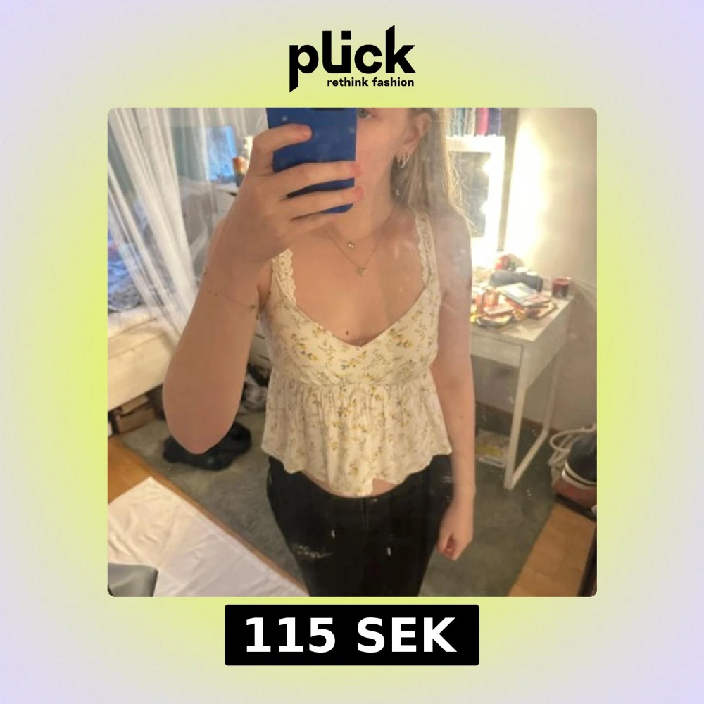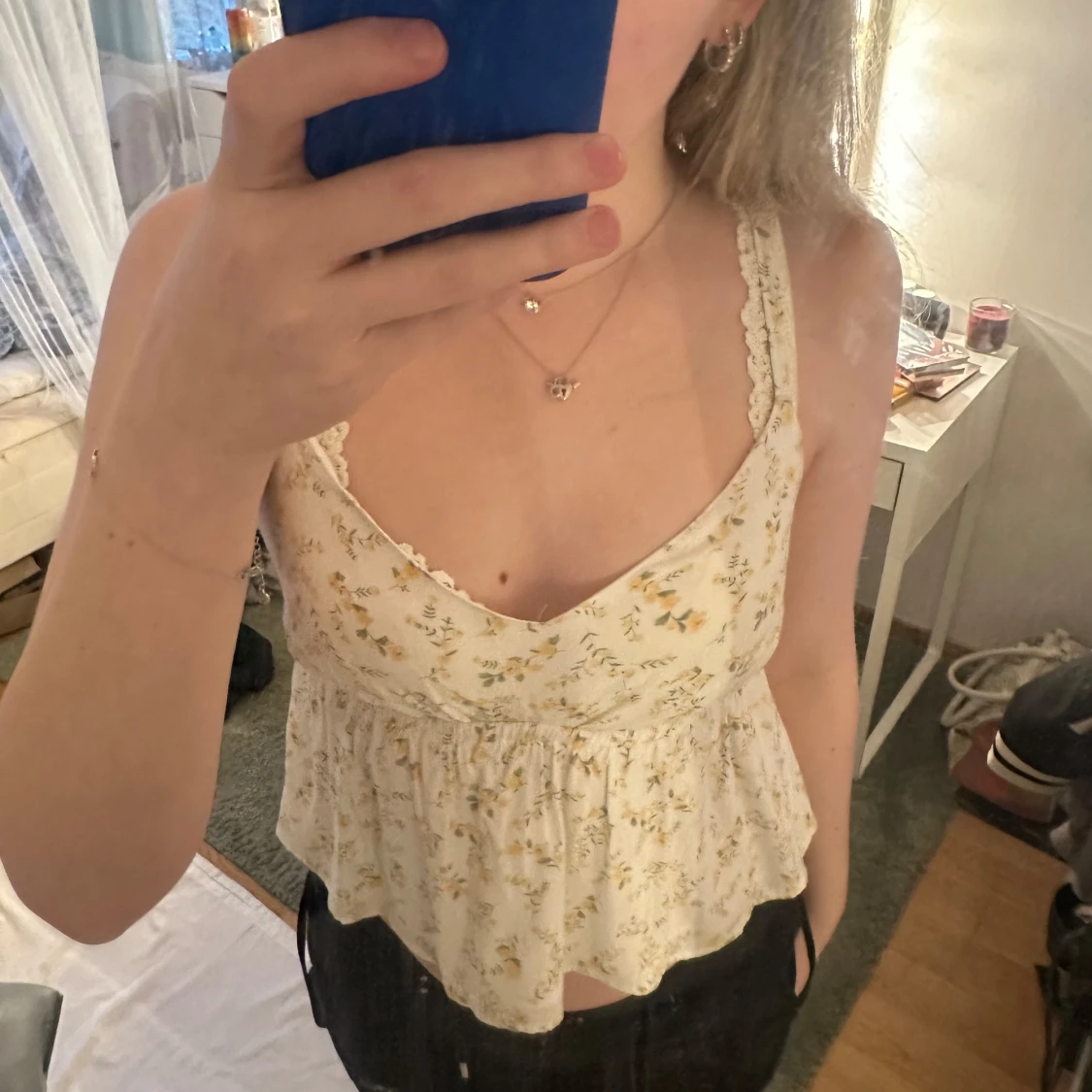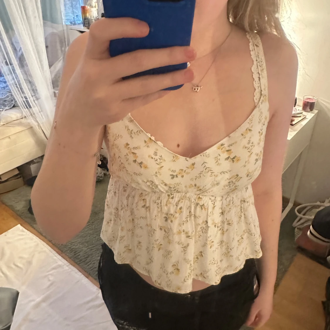Säljer en söt vit linnetopp med blommigt mönster i gult och grönt. Toppen har spetsdetaljer vid axelbanden och en v-ringad design. Perfekt för varma sommardagar!