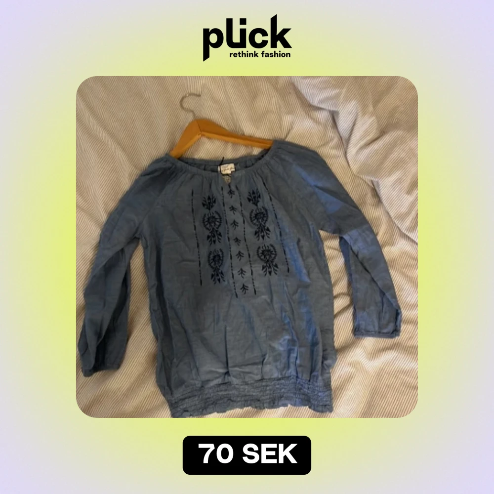 Säljer en söt blå blus med broderi på framsidan. Blusen har långa ärmar och en elastisk nederkant som ger en fin passform. Perfekt för både vardag och fest!