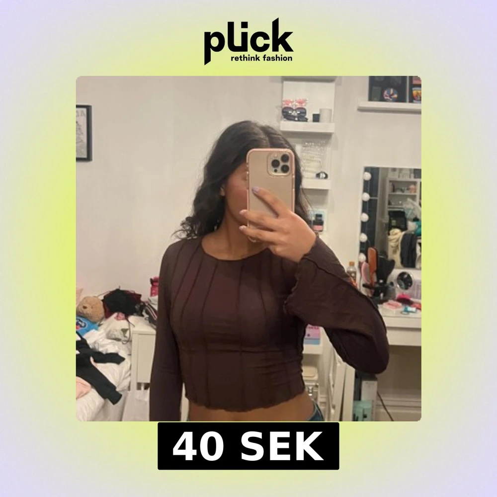 Säljer en brun långärmad croppad topp med rund hals. Toppen har en stilren design och är perfekt för en trendig look. Passar bra till jeans eller kjol.