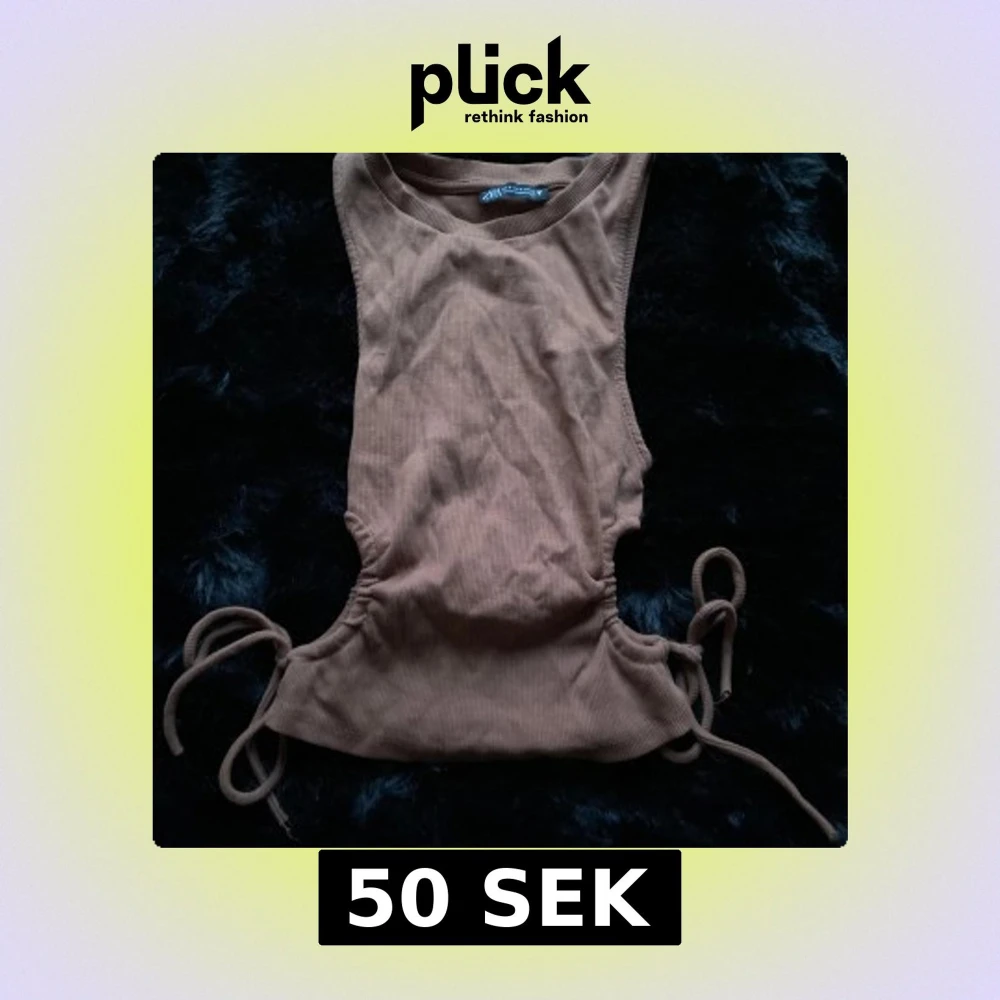 Säljer en brun ribbad linnetopp från Zara med knytband i sidorna. Toppen har en rund halsringning och är ärmlös, perfekt för en avslappnad stil.