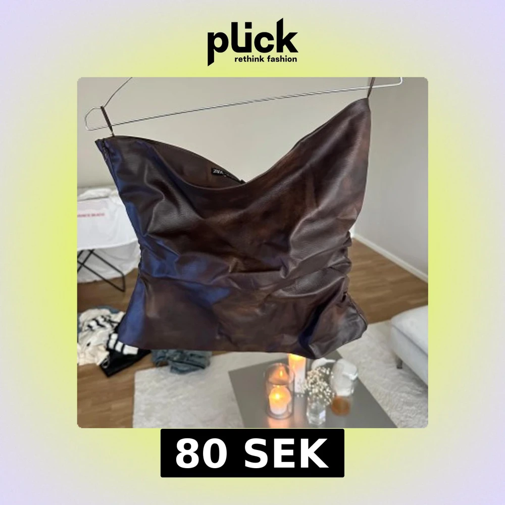 Snygg brun tubtopp från Zara i skinnimitation med lätt rynkade sidor. Toppen har en cool, glansig finish och bandeau-modell som sitter tight över bröstet. Perfekt att styla med jeans eller kjol för en trendig look.🤎