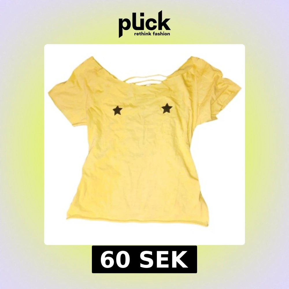 Säljer en gul topp med svarta stjärnor framtill och en unik öppen rygg med snörningsdetaljer. Toppen har korta ärmar och en lös passform. Perfekt för en avslappnad stil.