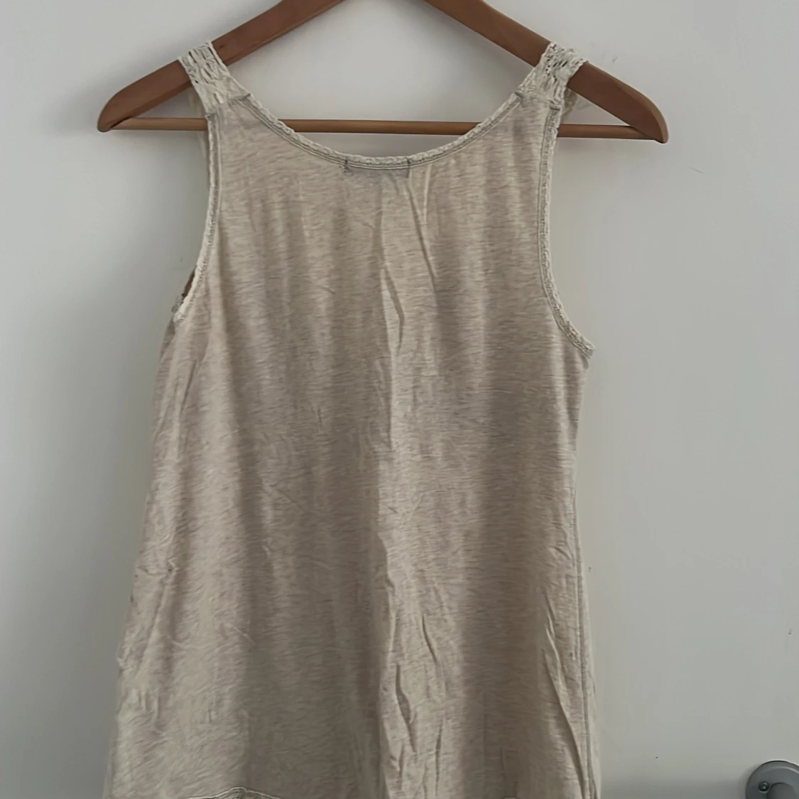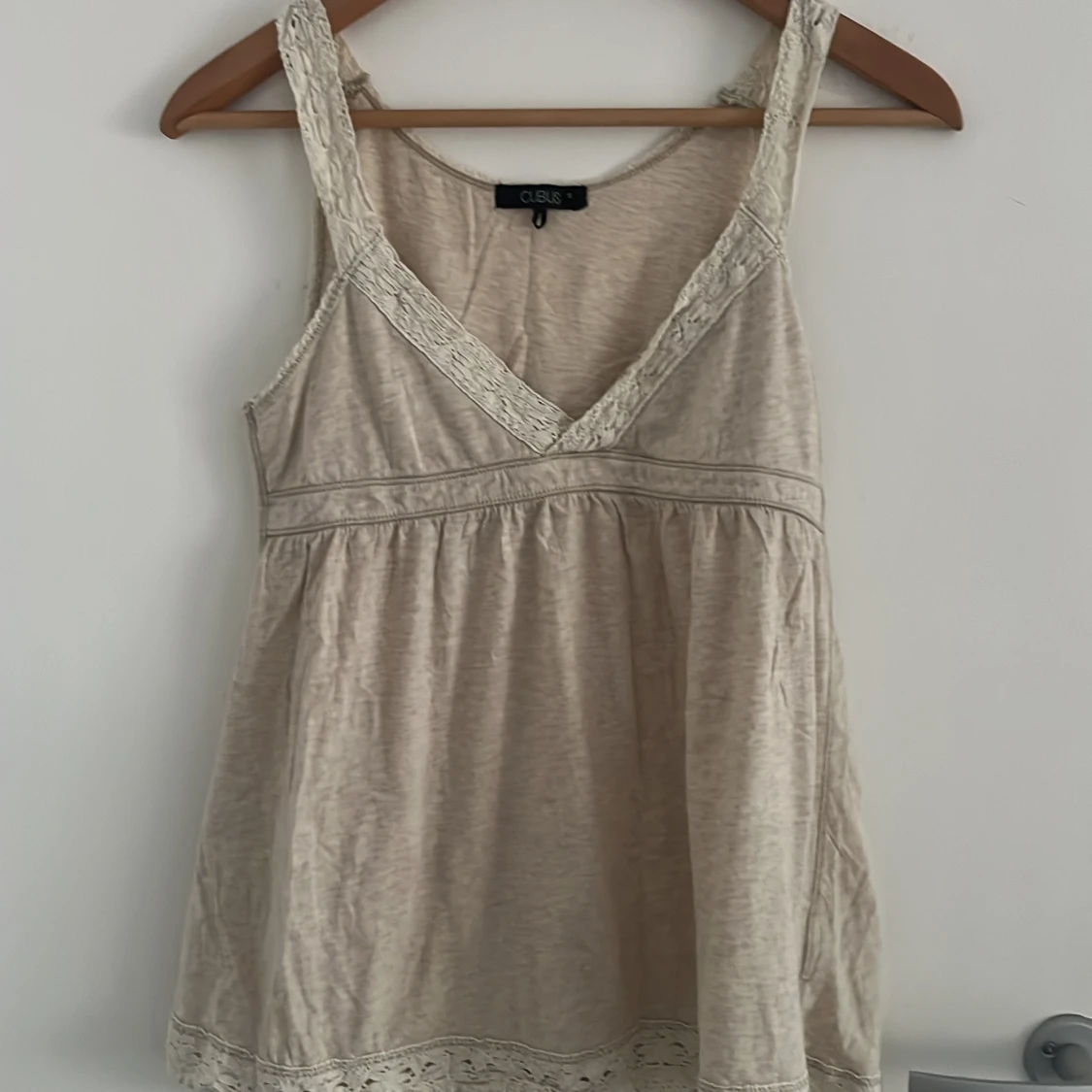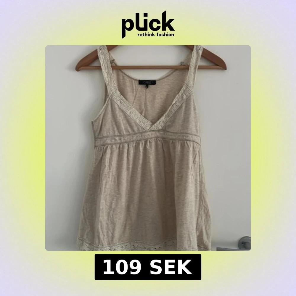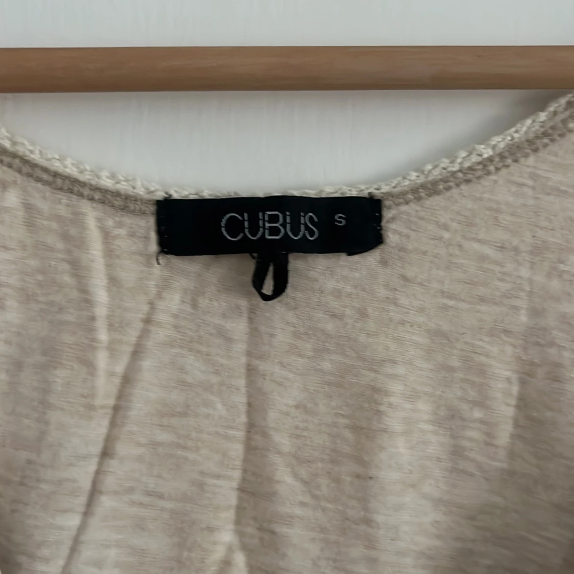 Säljer en söt beige linnetopp från Cubus med v-ringning och spetsdetaljer längs axelbanden och nederkanten. Toppen är ärmlös och har en avslappnad passform, perfekt för varma dagar. Tillverkad i mjuk bomull för en skön känsla.