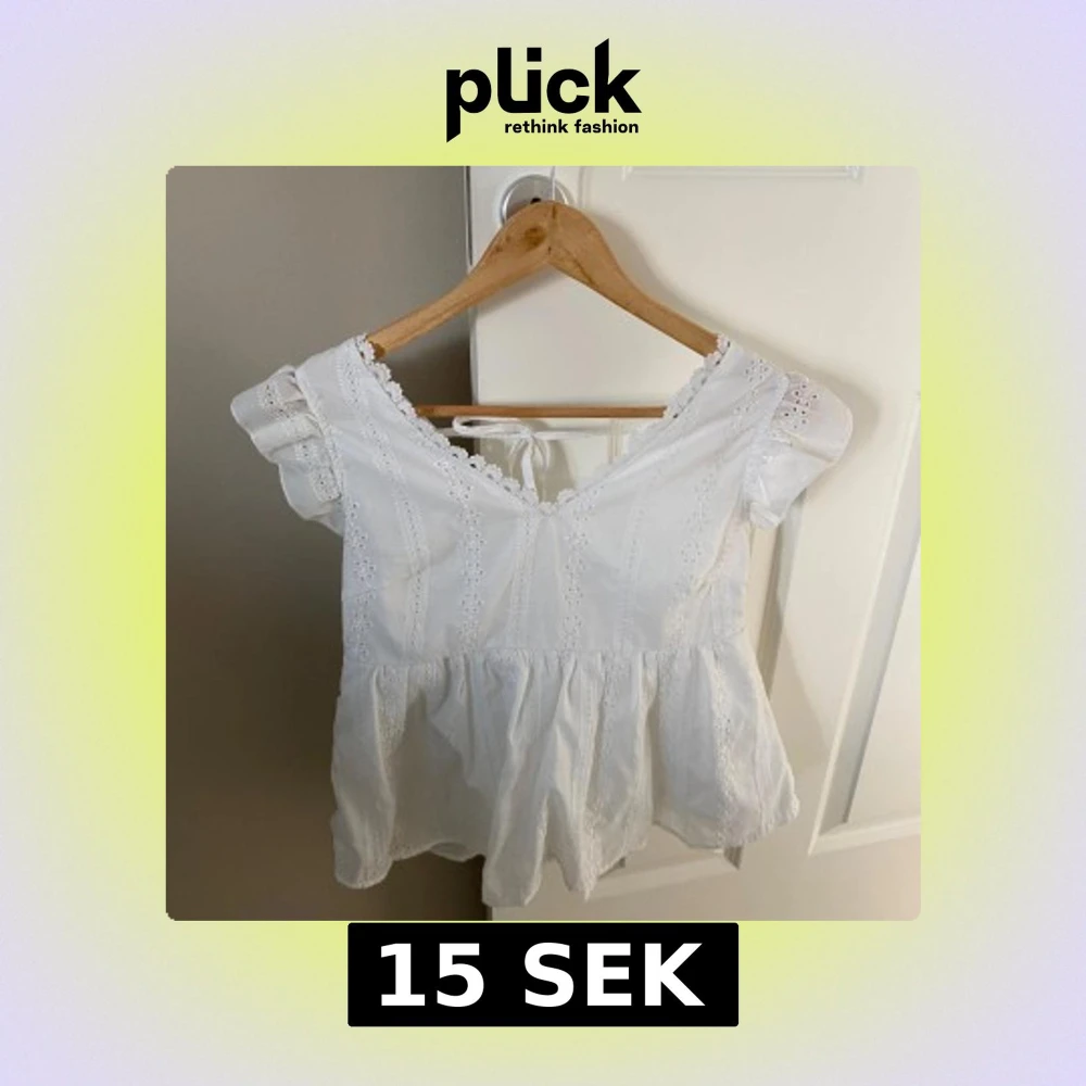 Vit blus med spetsdetaljer från SHEIN - Säljer en söt vit blus från SHEIN med v-ringning och volang nertill. Blusen har korta ärmar med broderad spets och blommiga detaljer. Perfekt för vår och sommar!