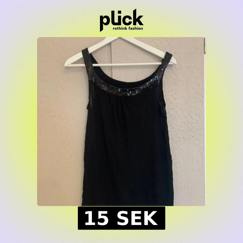 Snygg svart ärmlös topp från Amisu med paljettdetaljer vid halsringningen. Perfekt för en stilren look. Tillverkad i ett mjukt och bekvämt material. Litet hål på vänstra framsidan. De sista bilden.