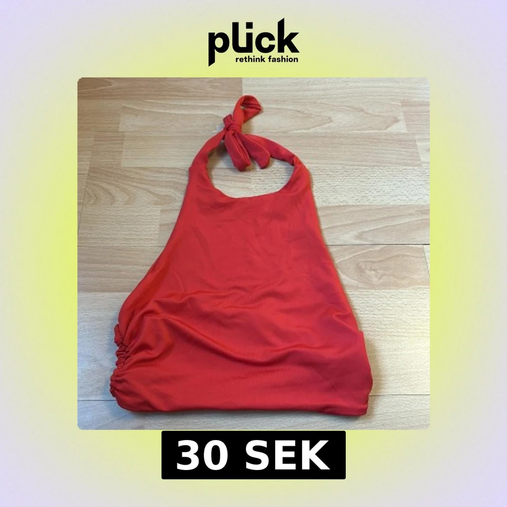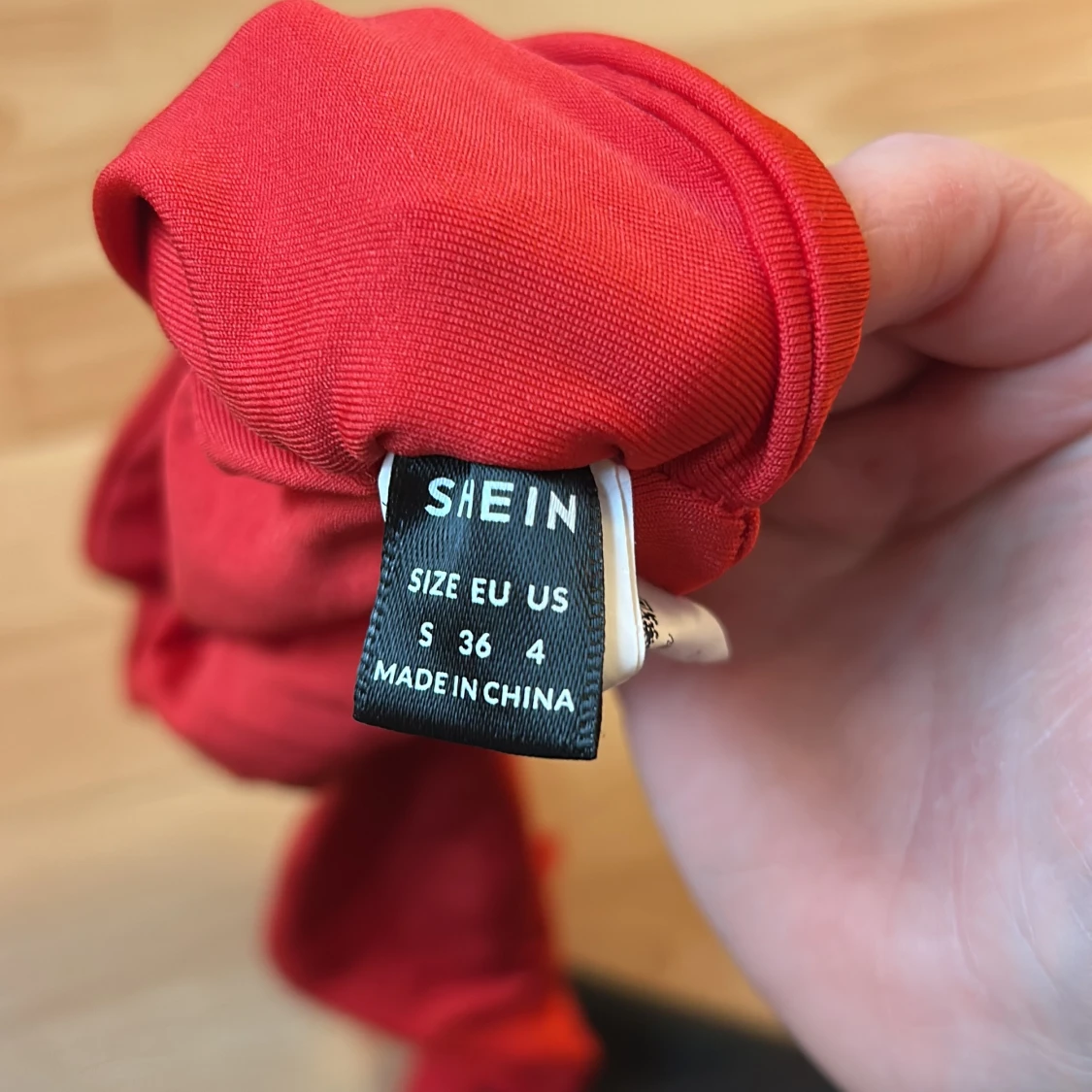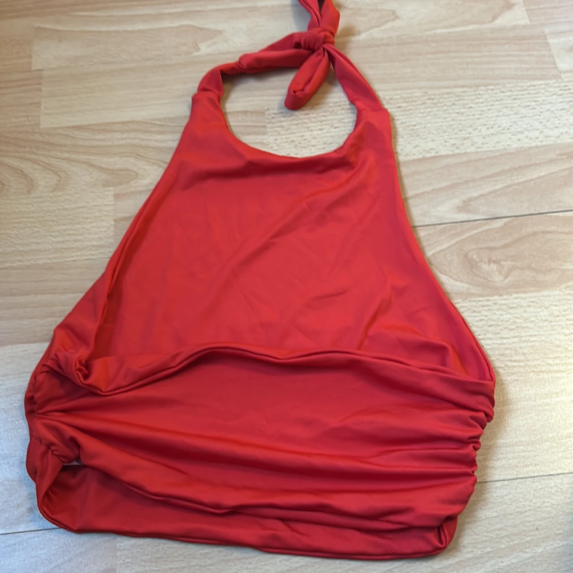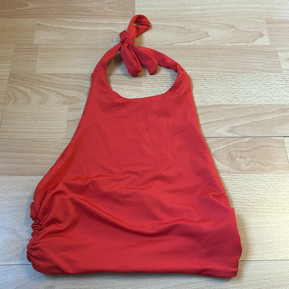 Trendig röd topp från Shein med knytband i nacken. Den har en enkel och stilren design som ger en snygg look.