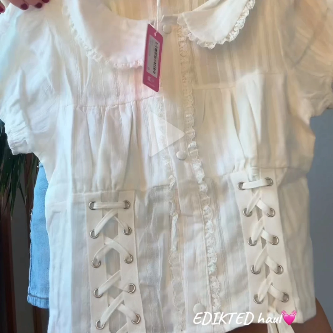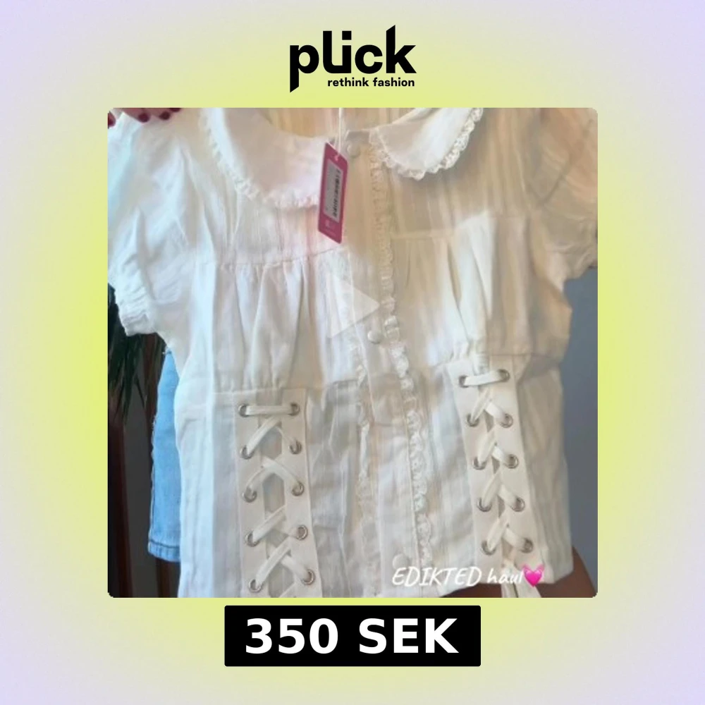 Supersöt vit blus från Edikted med korta puffärmar, spetsdetaljer vid kragen och knappar framtill. Blusen är croppad och har snygg snörning i sidorna som ger en unik look. Perfekt för dig som gillar romantisk och trendig stil.