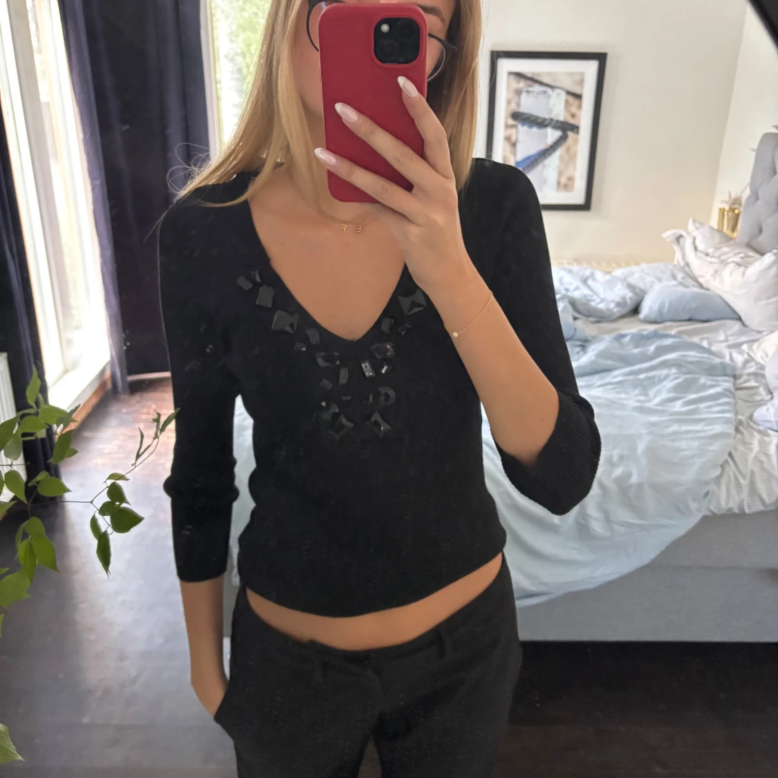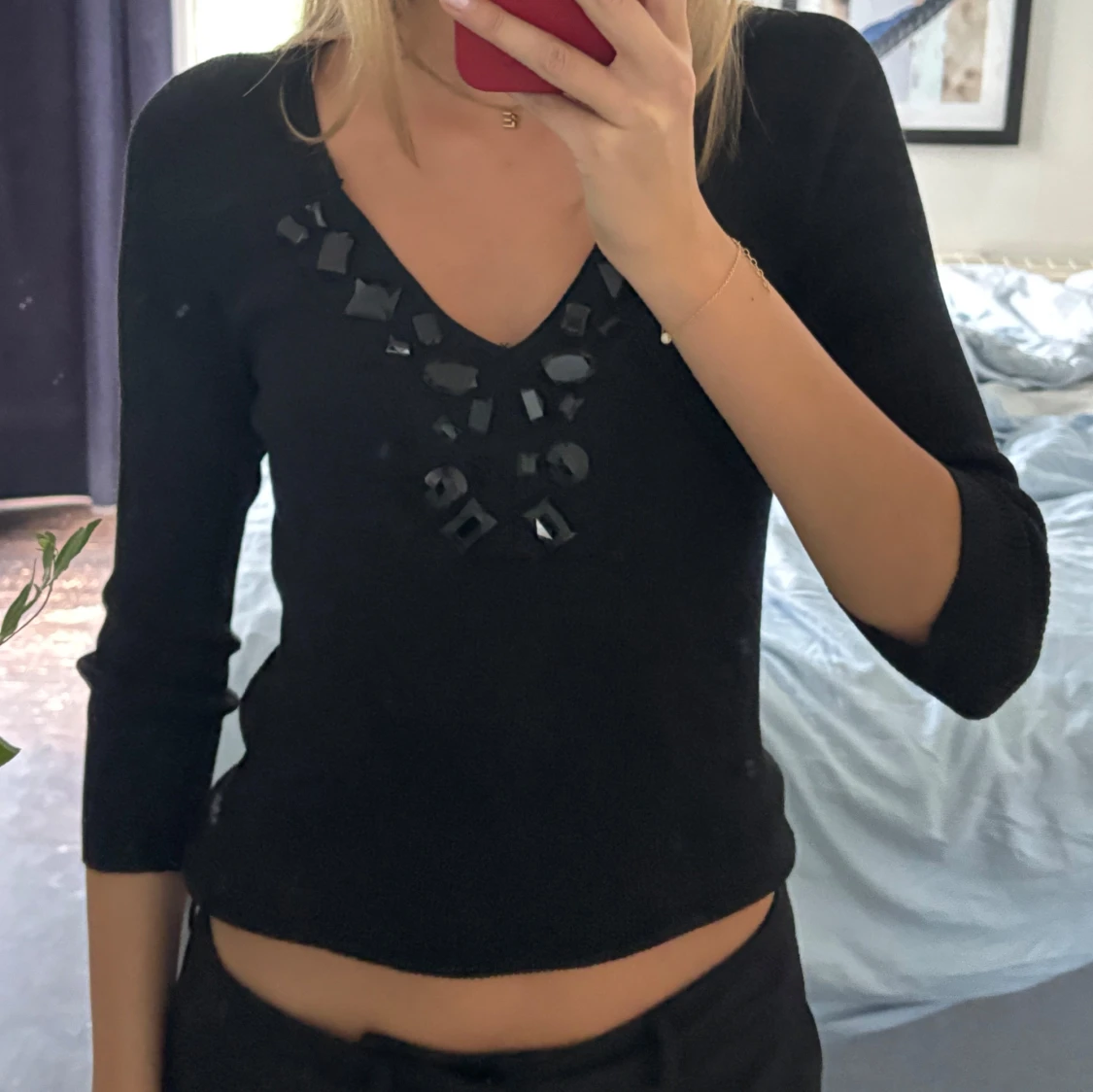 Svart topp med v-ringning och coola svarta pärldetaljer runt halsen. Modellen är croppad och har trekvartsärm, vilket ger en trendig och stilren look. Skirv vid funderingar!💞💞