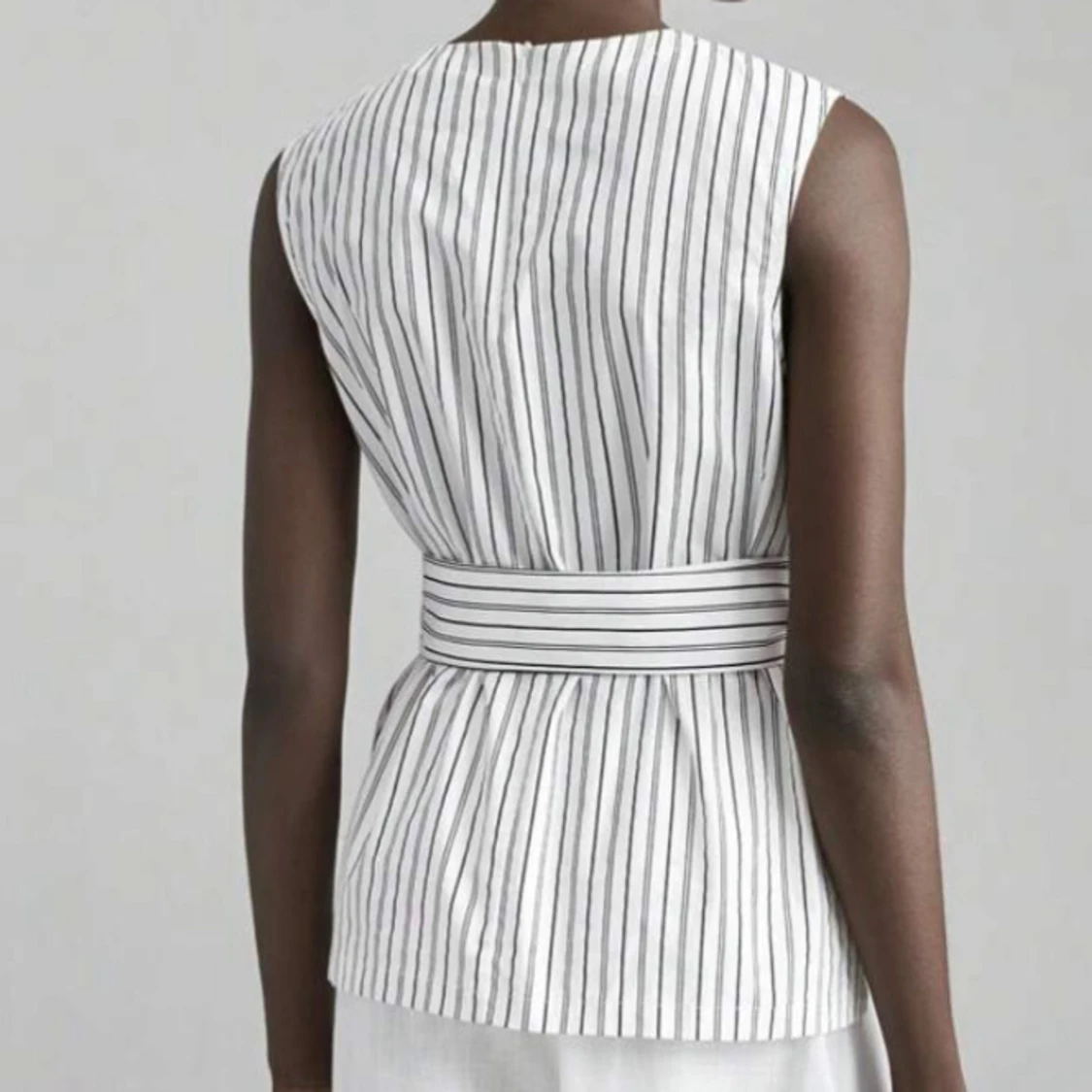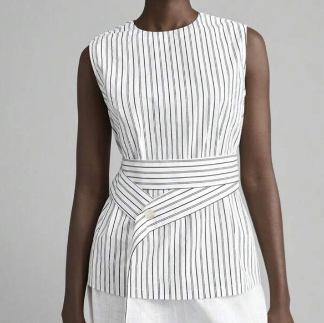 Snygg vit ärmlös blus med svarta vertikala ränder och bredt bälte i midjan som knäpps med en knapp. Bältet har horisontella ränder för en cool kontrast. Perfekt till både jeans och kjol för en stilren look.