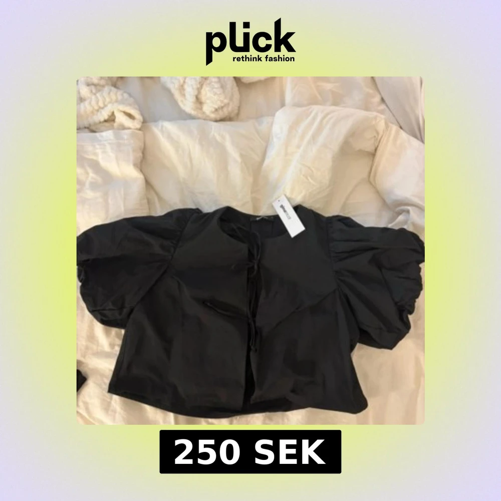 Svart blus från Gina Tricot med puffiga ärmar och snygga knytningar framtill. Blusen har en croppad passform och är tillverkad i mjuk bomull. Busen är helt ny!