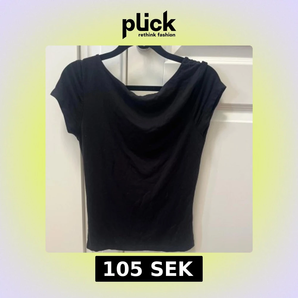 Svart topp från Gina Tricot med korta ärmar och snygg draperad urringning fram. Baksidan har en djup öppen rygg som ger en cool och trendig look. Tillverkad i mjuk bomull, perfekt att styla med jeans eller kjol.