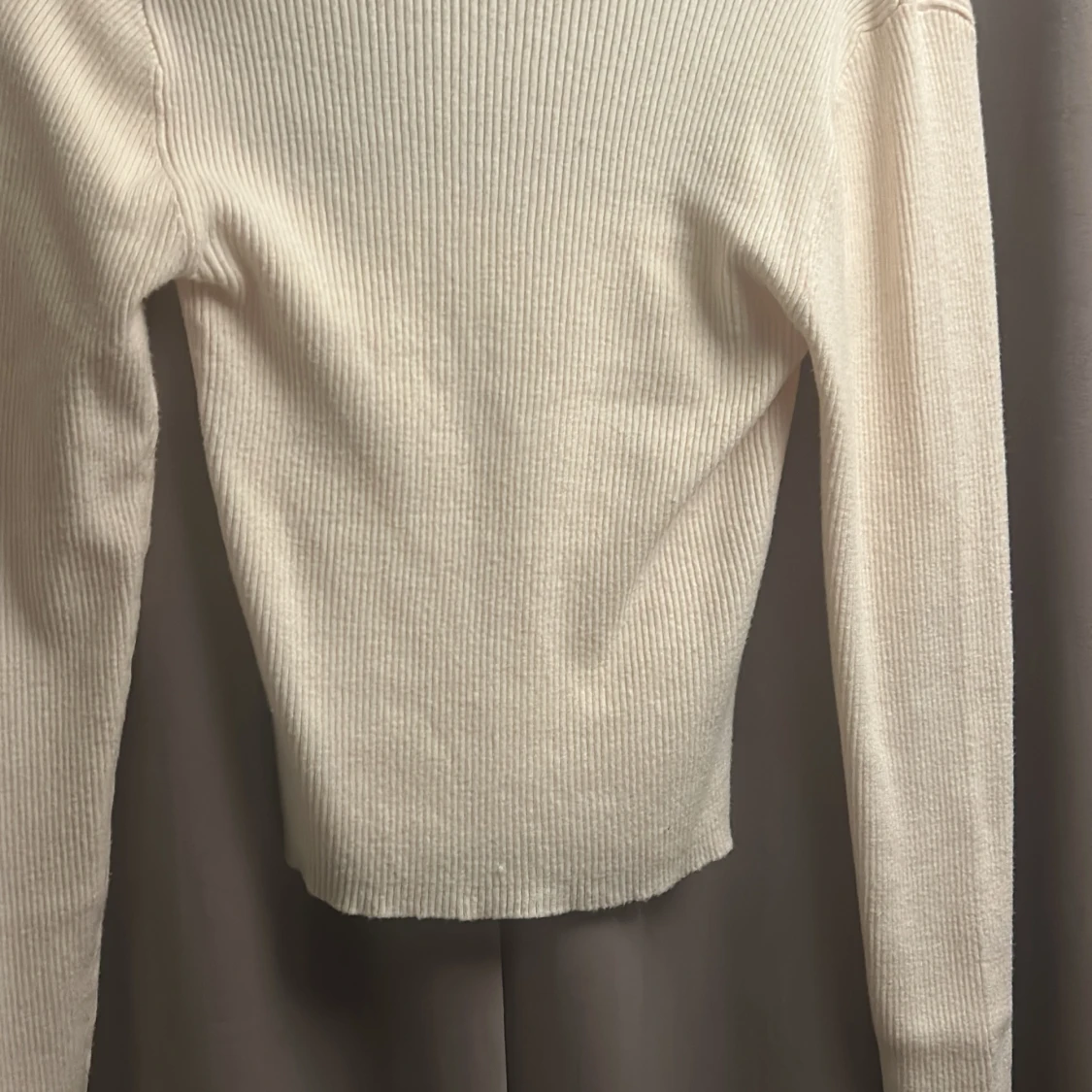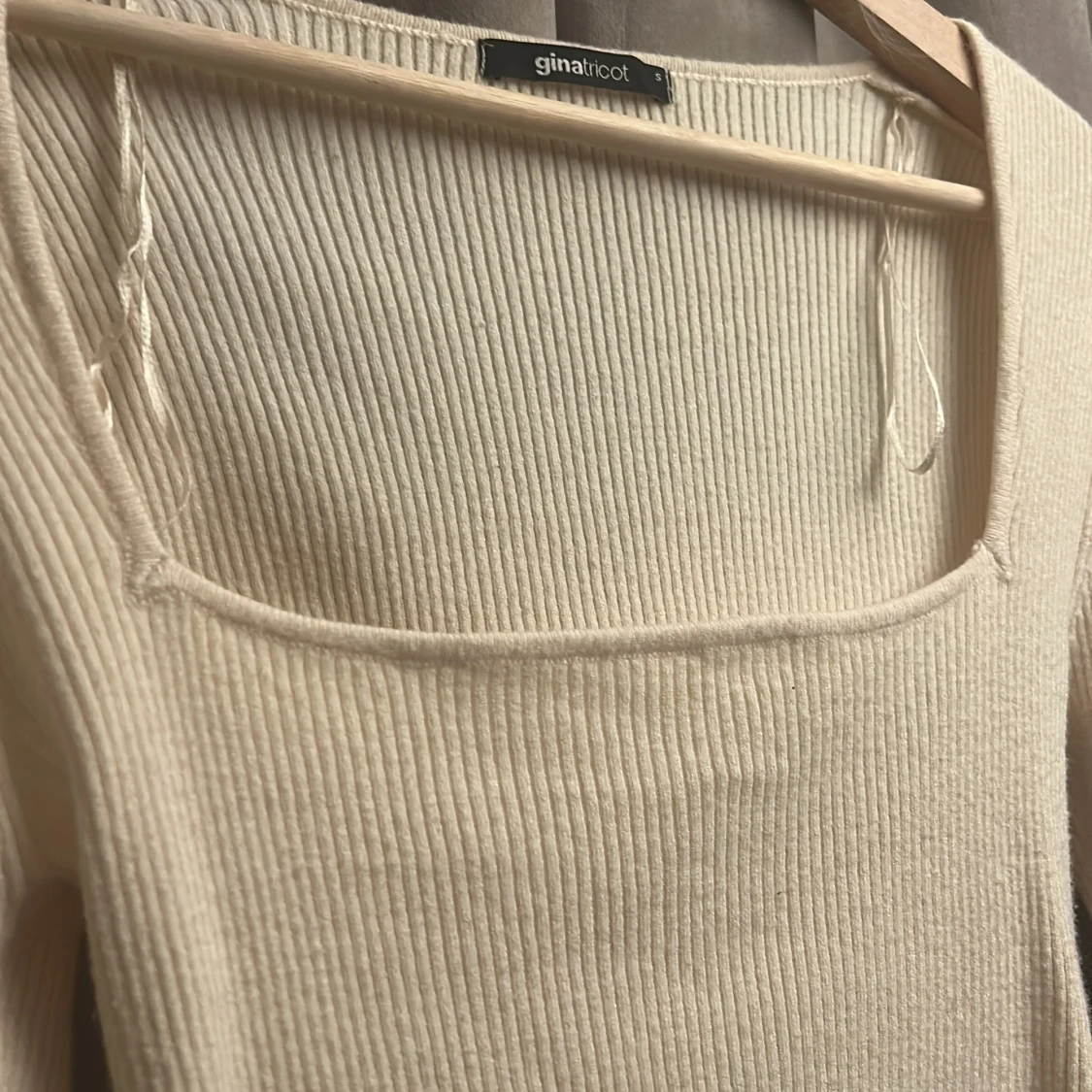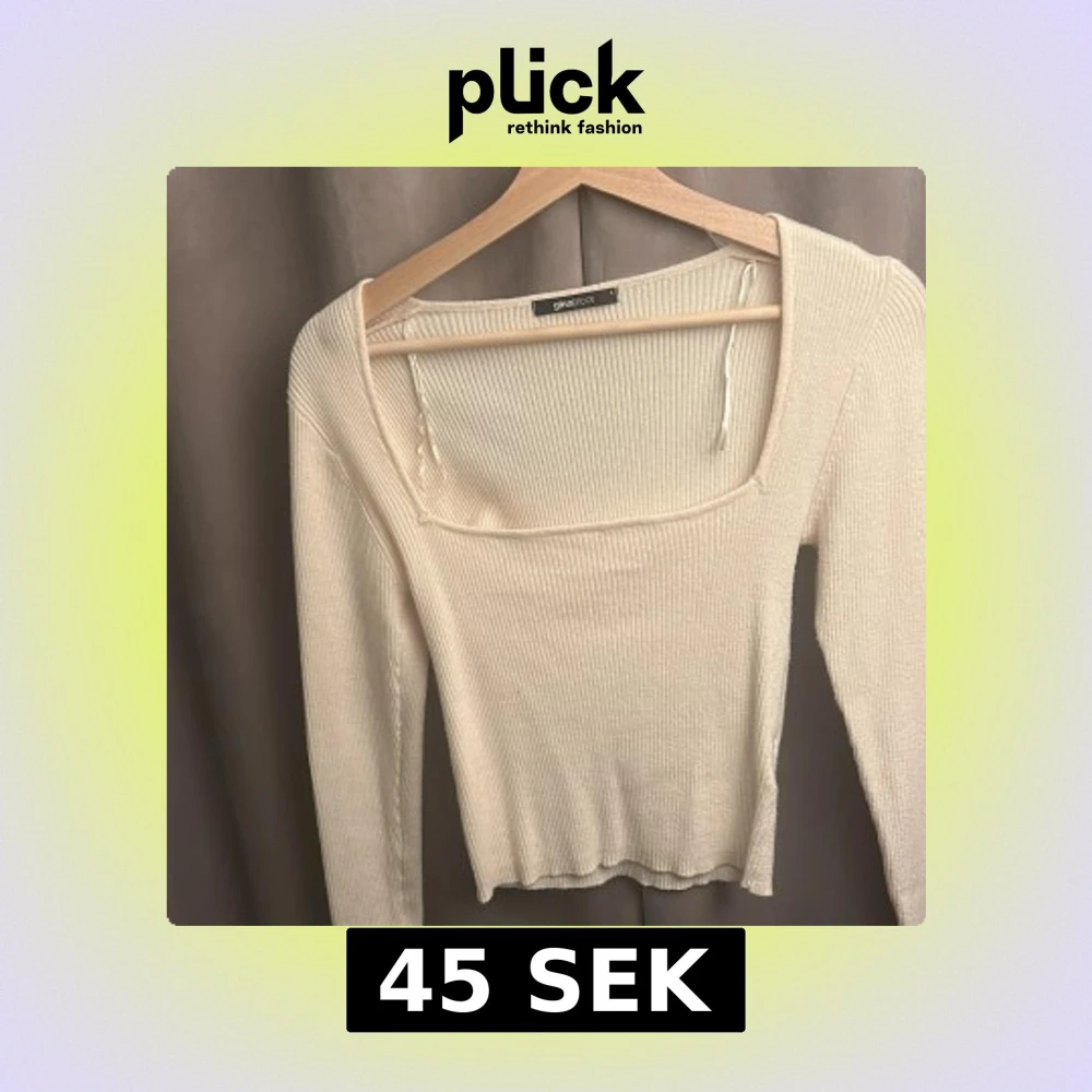 Ribbad långärmad topp från Gina Tricot i mjuk vit färg. Toppen har fyrkantig urringning och en liten slits vid ärmslutet för en extra detalj. Perfekt att styla med jeans eller kjol för en clean look. Tröjan är aldrig använd då den inte passat i storleken